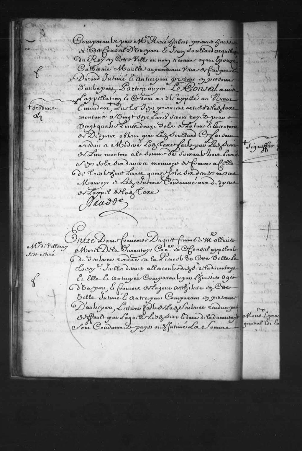 Transcription du texte avec orthographe modernisée : «Monsieur de Villeray s'est retiré. Entre dame Françoise DUQUET femme de maître Olivier Morel de Ladurantaye conseiller en ce Conseil appelante de sentence rendue en la prévôté de cette ville le treize juillet dernier à l'encontre dudit sieur de Ladurantaye et elle et anticipée comparant par l'huissier Oger d'une part, et François de LAJOUE architecte en cette ville intimé et anticipant comparant en personne d'autre part, lecture faite de ladite sentence rendue par défaut par laquelle les sieur et dame de Ladurantaye sont condamnés payer audit intimé la somme de trois cent quarante et une livres d'une part et celle de dix livres d'autre sans préjudice d'une lettre de change et aux dépens, de l'acte d'appel interjeté de ladite sentence par ladite appelante le vingtième du même mois, de la requête présentée par ledit intimé aux fins d'être reçu anticipant enfin de laquelle est l [...]
