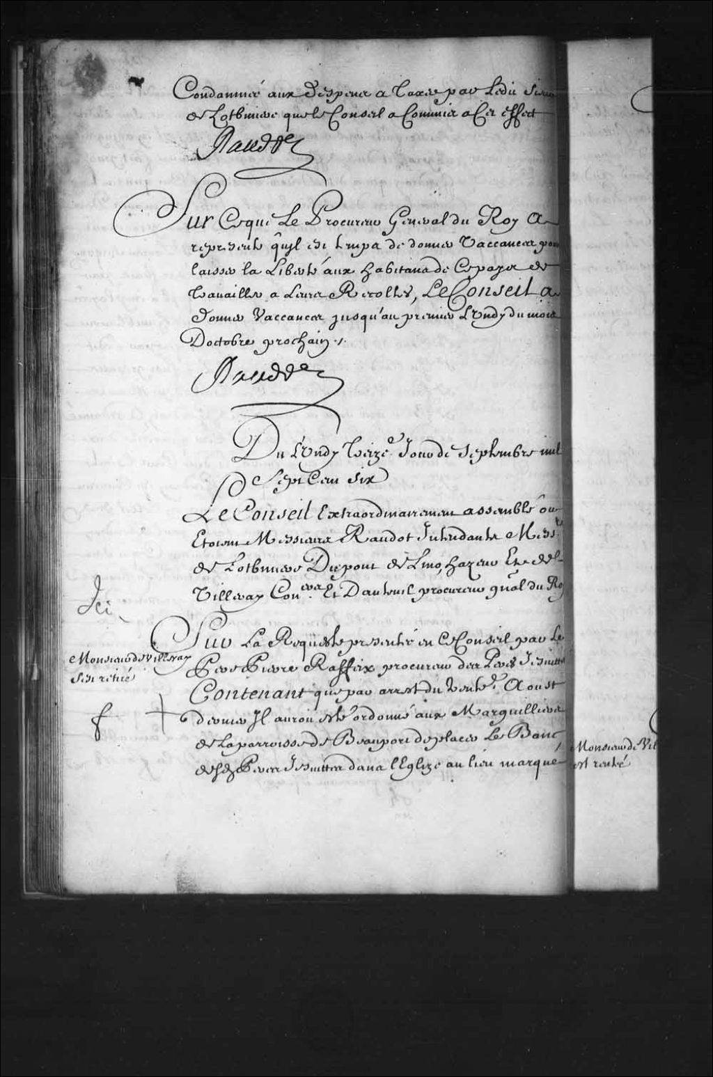 Transcription du texte avec orthographe modernisée : «Du lundi treizième jour de septembre mille sept cent six. Le Conseil extraordinairement assemblé où étaient Messieurs Raudot intendants Messieurs de Lotbinière Dupont Delino (De Lino) , Hazeur et de Villeray conseillers et d'Auteuil procureur général du Roi. Monsieur de Villeray s'est retiré. Sur la requête présentée en ce Conseil par le père Pierre Rafeix (Raffeix) procureur des pères jésuites contenant que par arrêt du trentième août dernier il aurait été ordonné aux marguilliers de la paroisse de Beauport de placer le banc desdits pères jésuites dans l'église au lieu marqué par ledit arrêt et que s'étant mis en devoir de l'exécuter Ils en auraient été empêchés par la dame de Saint-Martin usant de beaucoup de menaces et d'une manière qui attendait violence le tout en présence de témoins que par Prévoyance et précaution lesdits marguilliers avaient mené avec eux, ce qui les obligea pour ne pas agir de violence contre cette dame de faire rapporter le banc et renvoyer le menuisier et de perdre leur journée pour en faire leur plainte requérant qu'il plût au Conseil ordonner main-forte pour l'exécution dudit arrêt et que ceux qui s'y sont opposés soient condamnés à l'amende et à payer tous les frais faits et à faire, le Conseil vu ledit arrêt du trentième août dernier a ordonné et ordonne qu'il sera exécuté selon sa forme et teneur et en conséquence que les huissiers Hubert et Dubreuil se transporterons demain mardi quatorzième de ce mois dans ladite église de Beauport et y ferons placer le banc des pères jésuites dans l'endroit marqué par ledit arrêt et que les sieur et dame de Saint-Martin seront assignés pour en venir lundi prochain au Conseil afin de répondre aux demandes faites par ledit père Raffeix. RAUDOT.»