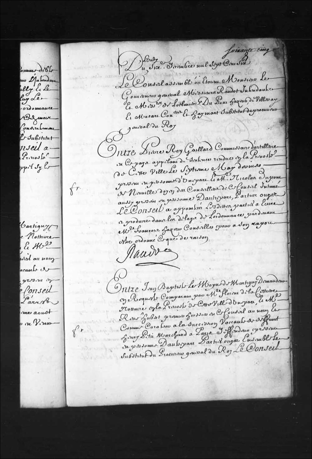 - Transcription du texte avec orthographe modernisée : «Entre Jean-Baptiste LEMOYNE (Lemoine) de MARTIGNY demandeur en requête comparant par maître Florent de LaCettière (Lacetière) notaire en la prévôté de cette ville d'une part, et maître René HUBERT premier huissier en ce Conseil au nom et comme curateur à la succession vacante de défunt Henri Petit marchand à Paris défendeur présent en personne d'autre part. Parties ouïes ensemble le substitut du procureur général du Roi. Le Conseil avant faire droit sur ladite requête a ordonné et ordonne que Joseph Petit Bruneau sera assigné pour en venir en ce Conseil dans un mois du jour de la signification du présent arrêt. RAUDOT.»