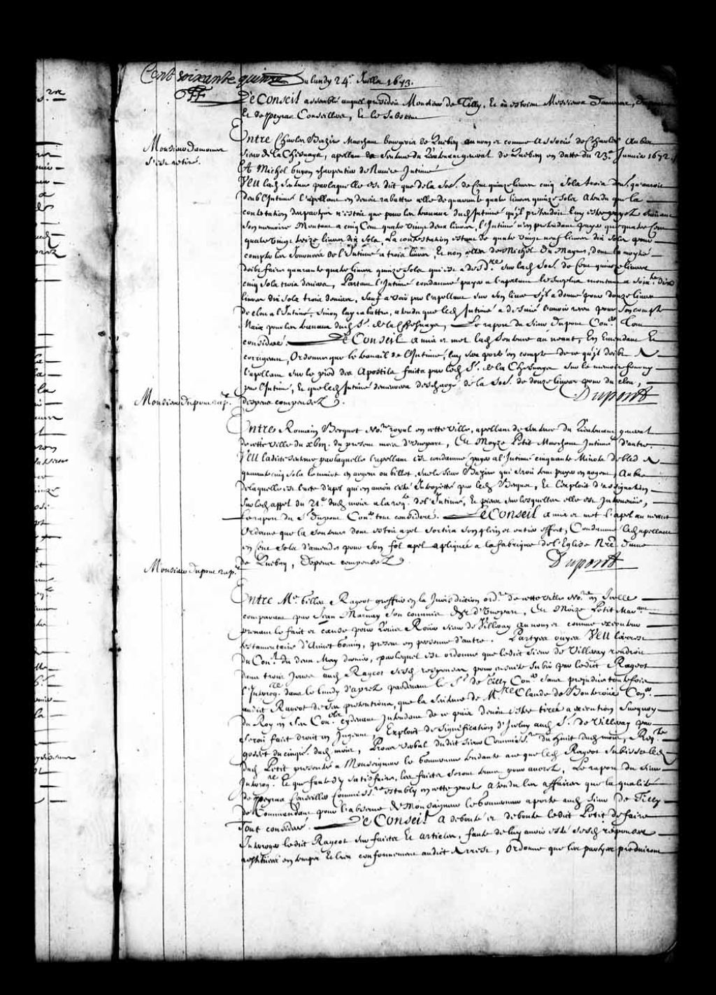 - Transcription du texte avec orthographe modernisée : «Du lundi vingt-quatrième juillet 1673. Le Conseil assemblé auquel présidait Monsieur de Tilly, et où étaient Messieurs Damours, Dupont, et Depeiras conseillers, et le substitut. Monsieur Damours s'est retiré. Entre Charles BAZIRE marchand bourgeois de Québec au nom et comme associé de Charles Aubert sieur de Lachesnaye, appelant de sentence du lieutenant général de Québec en date du vingt-troisième janvier 1672, et Michel GUYON charpentier de navire intimé vu ladite sentence par laquelle est dit que de la somme de cent quinze livres cinq sols trois deniers qu'auraient dû l'intimé, l'appelant devait rabattre celle de quarante-quatre livres quinze sols attendu que la contestation des parties n'était que pour les travaux dudit intimé qu'il prétendait lui être payés suivant son mémoire montant à cinq cent quatre-vingt-deux livres, l'intimé n'en prétendant payer que quatre cent quatre [...]