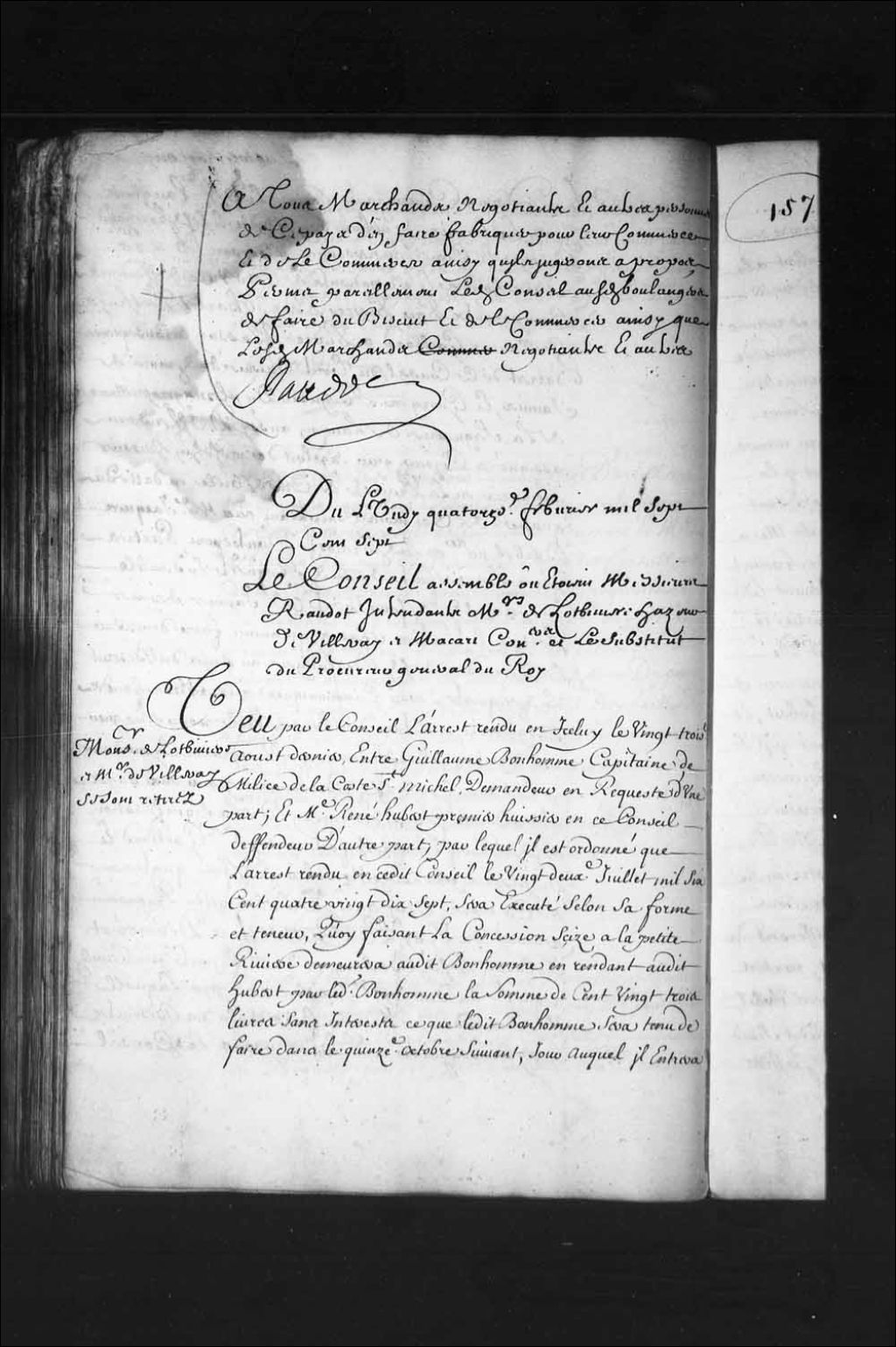 - Transcription du texte avec orthographe modernisée : «Du lundi quatorzième février mille sept cent sept. Le Conseil assemblé où étaient Messieurs Raudot intendants Messieurs de Lotbinière Hazeur de Villeray et Macart (Macard) conseillers et le substitut du procureur général du Roi. Monsieur de Lotbinière et Monsieur de Villeray se sont retirés. Vu par le Conseil l'arrêt rendu en icelui le vingt-troisième août dernier, entre Guillaume Bonhomme capitaine de milice de la côte Saint-Michel, demandeur en requête d'une part; et maître René Hubert premier huissier en ce Conseil défendeur d'autre part; par lequel il est ordonné que l'arrêt rendu en ce dit Conseil le vingt-deuxième juillet mille six cent quatre-vingt-dix-sept, sera exécuté selon sa forme et teneur, quoi faisant la concession sise à la petite rivière demeurera audit Bonhomme en rendant audit Hubert par ledit Bonhomme la somme de cent vingt-trois livres sans intérêts ce que ledit [...]