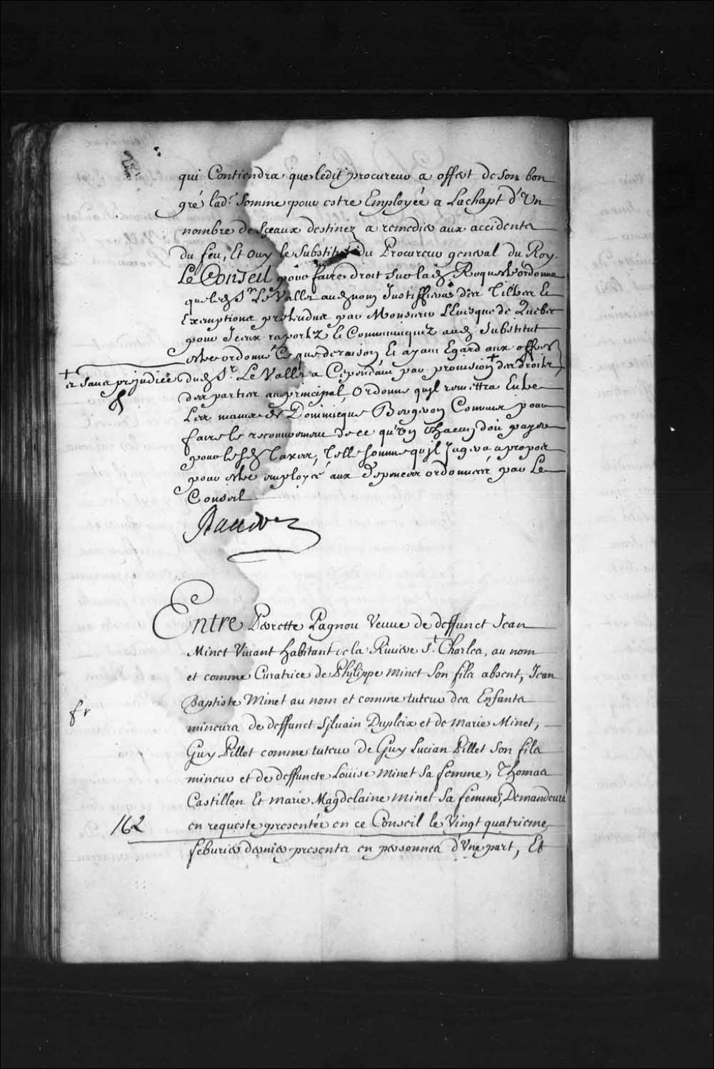 - Transcription du texte avec orthographe modernisée : «Entre Perrette PAGNOU (Pagnoux) veuve de défunt Jean Minet vivant habitant de la Rivière Saint-Charles, au nom et comme curatrice de Philippe Minet son fils absent, Jean-Baptiste Minet au nom et comme tuteur des enfants mineurs de défunt Sylvain Dupleix et de Marie Minet, Guy Pillet comme tuteur de Guy Lucien Pillet son fils mineur et de défunte Louise Minet sa femme, Thomas Castillon et Marie Madeleine Minet sa femme, demandeurs en requête présentée en ce Conseil le vingt-quatrième février dernier présents en personnes d'une part, et Nicolas Bailly et Anne BONHOMME sa femme auparavant veuve de Jean Minet et tutrice des enfants mineurs dudit défunt Minet et d'elle défendeurs aussi présents en personnes d'autre part, ouï lesdits demandeurs, et lecture faite de ladite requête expositive que quoi qu'ils aient procédé au partage des biens immeubles de la communauté qui a été entre ledit [...]