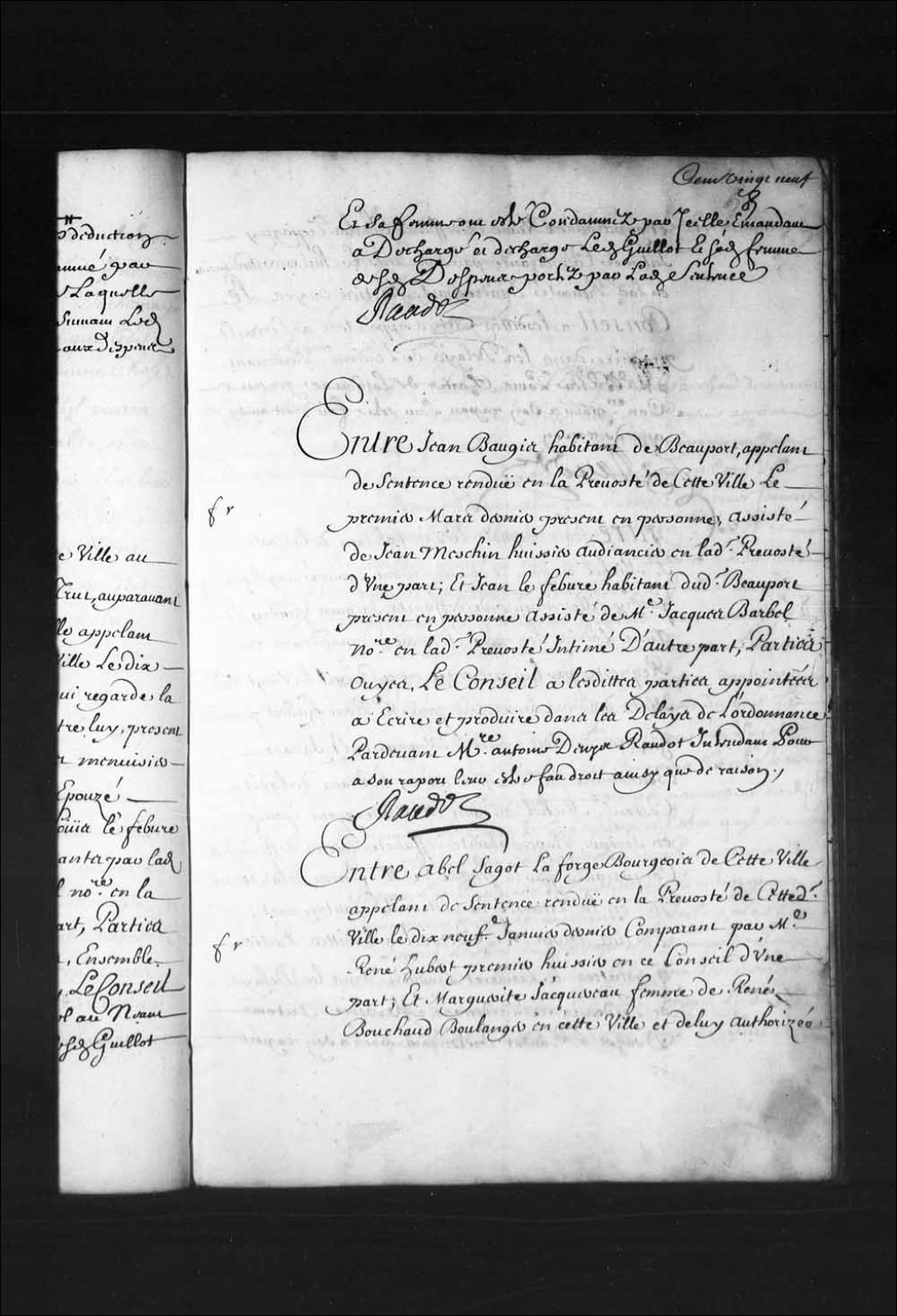 Transcription du texte avec orthographe modernisée : «Entre Abel SAGOT LAFORGE Bourgeois de cette ville appelant de sentence rendue en la prévôté de cette dite ville le dix-neuvième janvier dernier comparant par maître René Hubert premier huissier en ce Conseil d'une part; et Marguerite JACQUEREAU femme de René Bouchaud (Boucheau) boulanger en cette ville et de lui autorisée et auparavant veuve défunt Charles Trepagny (Trépanier) intimée comparante par Jean Méchin (Meschin) huissier audiencier en ladite prévôté d'autre part. Parties ouïes, le Conseil a lesdites parties appointées à écrire et produire dans les délais de l'ordonnance par-devant maître René Louis Chartier de Lotbinière premier conseiller pour à son rapport leur être fait droit ainsi que de raison. RAUDOT.»
