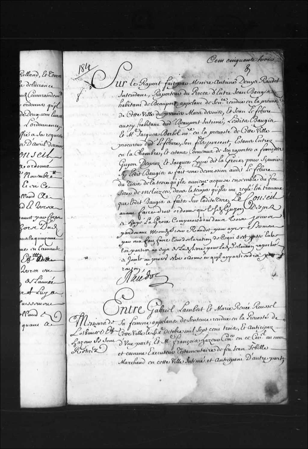 - Transcription du texte avec orthographe modernisée : «Messieurs de Lotbinière et Hazeur se sont retirés. Entre Gabriel LAMBERT et Marie Renée ROUSSEL sa femme appelants de sentence rendue en la prévôté de cette ville le sixième octobre mille sept cent trois. Et anticipés d'une part; et maître François HAZEUR conseiller en ce Conseil au nom et comme exécuteur testamentaire de feu Jean Sebille marchand en cette ville intimé et anticipant d'autre part; vu ladite sentence par laquelle lesdits appelants sont condamnés à payer audit défunt Sebille la somme de cent cinquante-deux livres cinq sols en castor ou monnaie de France, et aux intérêts d'icelle, jusqu'au parfait payement, à commencer du jour de la demande, ou à déguerpir de la part et portion de la maison par eux acquise de Etienne Brault, et aux dépens, signification de ladite sentence faite à la requête dudit feu Sebille par Oger huissier auxdits appelants le dixième dudit mois d [...]