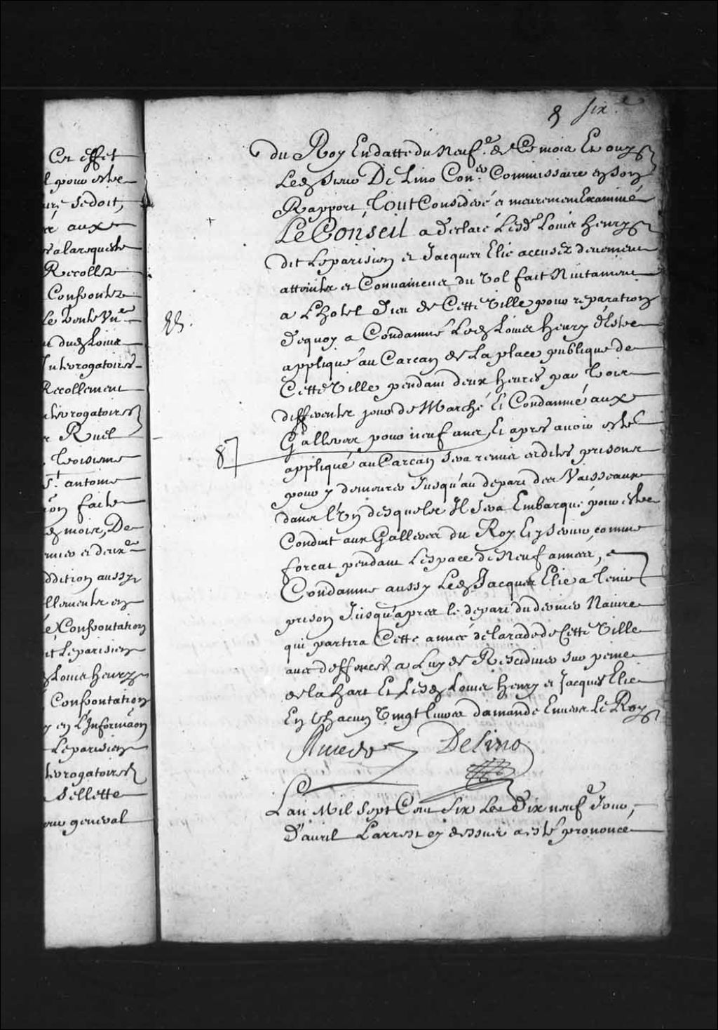 Exécution de l'arrêt du 12 avril 1706 par lequel sont condamné Louis Henry dit Le Parisien et Jacques Élie, maître des hautes oeuvres (bourreau) pour un vol commis à l'Hôtel-Dieu de Québec et pour recel, 12 avril 1706, Archives nationales à Québec, Fonds Conseil souverain, (03Q,TP1,S28,P8465).