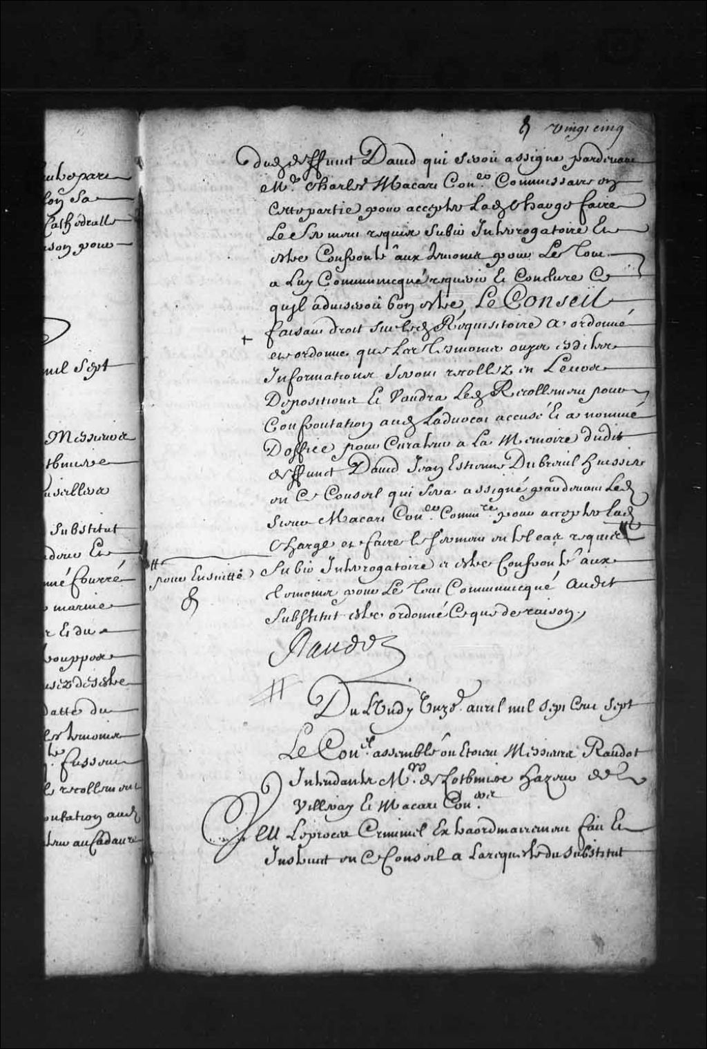 - Transcription du texte avec orthographe modernisée : «Du lundi onzième avril mille sept cent sept. Le Conseil assemblé où étaient Messieurs Raudot intendants Messieurs de Lotbinière Hazeur de Villeray et Macart (Macard) conseillers. Vu le procès criminel extraordinairement fait et instruit en ce Conseil à la requête du substitut du procureur général du Roi demandeur et accusateur à l'encontre de Charles Emmanuel Fourré dit Lavocat soldat dans les troupes du détachement de la marine entretenues par sa Majesté en ce pays et Charles LeGris dit David sergent dans lesdites troupes défendeurs et accusés de s'être battus en duel dans lequel combat ledit David a été blessé, et mort le jour suivant, et Jean Etienne Dubreuil huissier de ce dit Conseil nommé d'office pour curateur à la mémoire dudit défunt David par arrêt du 14e mars dernier, la plainte faite à Monsieur le marquis de Vaudreuil gouverneur et lieutenant général en ce dit pays par [...]
