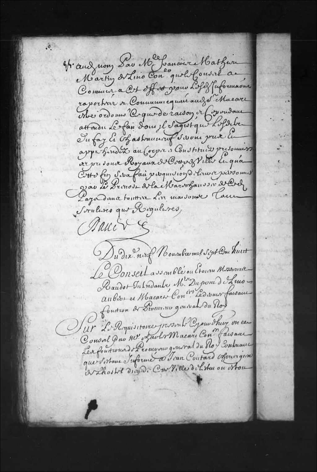 - Transcription du texte avec orthographe modernisée : «Du dix-neuf novembre mille sept cent huit. Le Conseil assemblé où étaient Messieurs Raudot intendants, Messieurs Dupont Delino (De Lino), Aubert et Macart (Macard) conseillers le dernier faisant fonctions de procureur général du Roi. Sur le réquisitoire présenté ce jourd'hui en ce Conseil par maître Charles Macart (Macard) conseiller faisant les fonctions de procureur général du Roi contenant que s'étant informé à Jean Coutard (Coustard) chirurgien de l'Hôtel-Dieu de cette ville de l'état où était le nommé Claude Dufaye (du Faye, Dufay) soldat des troupes du détachement de la marine en ce pays ci-devant prisonnier des prisons royaux du palais conduit et envoyé audit Hôtel-Dieu pour y être pansé d'une blessure qu'il avait, accusé de s'être battu en duel avec le nommé Châteauneuf aussi soldat dudit détachement, ledit Couttard lui aurait dit qu'il y avait sept à huit jours qu'il n'avait [...]