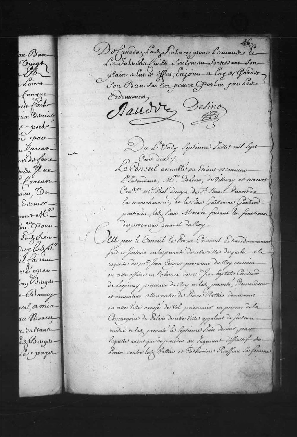 - Transcription du texte avec orthographe modernisée : «Du lundi septième juillet mille sept cent dix. Le Conseil assemblé où étaient monsieur l'intendant, Messieurs Delino (De Lino), de Villeray et Macart (Macard) conseillers maître Paul Denys (Denis) de Saint-Simon prévôt de la maréchaussée, et le sieur Guillaume Gaillard praticien, ledit sieur Macart (Macard) faisant les fonctions de procureur général du Roi. Vu par le Conseil le procès criminel extraordinairement fait et instruit en la prévôté de cette ville de Québec à la requête de me Jean Coignet procureur du Roi commis en cette affaire en l'absence de maître Jean-Baptiste Couillard de Lespinay procureur du Roi en ladite prévôté, demandeur et accusateur à l'encontre de Pierre Rattier demeurant en cette ville accusé de vol prisonnier des prisons de la conciergerie du palais de cette ville appelant de sentence rendue en ladite prévôté le septième juin dernier, par laquelle avant que [...]