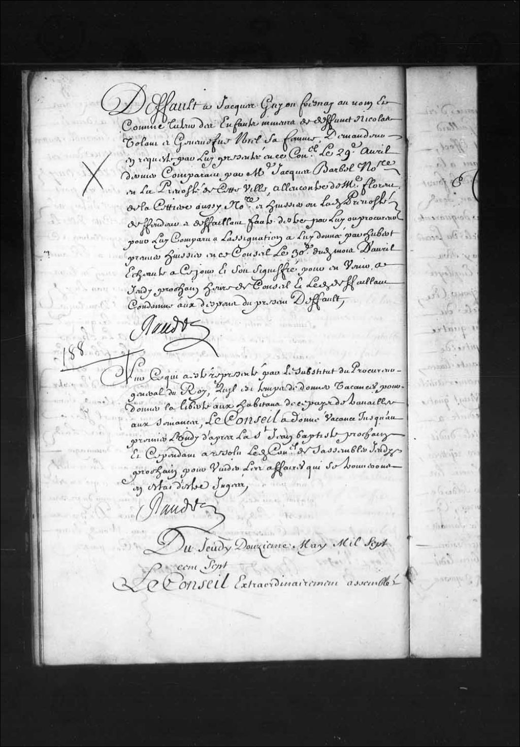 - Transcription du texte avec orthographe modernisée : «Du jeudi douzième mai mille sept cent sept. Le Conseil extraordinairement assemblé où étaient Messieurs Raudot intendants Messieurs de Lotbinière, Hazeur conseillers et le substitut du procureur général du Roi. Vu le défaut obtenu en ce Conseil le neuvième du présent mois par Jacques Guyon Fresnay (Dufresnay) au nom et comme tuteur des enfants mineurs de défunts Nicolas Volant, et Geneviève Niel sa femme demandeur en requête par lui présentée en ce Conseil le vingt-neuvième avril dernier à l'encontre de maître Florent de LaCettière (Lacetière) notaire et huissier en la prévôté de cette ville défendeur et défaillant, la signification dudit défaut faite audit de LaCettière (Lacetière) à la requête dudit Guyon Fresnay par Hubert premier huissier de ce Conseil le neuvième de ce mois, avec assignation à comparaître ce jourd'hui en ce Conseil pour voir adjuger le profit dudit défaut, [...]