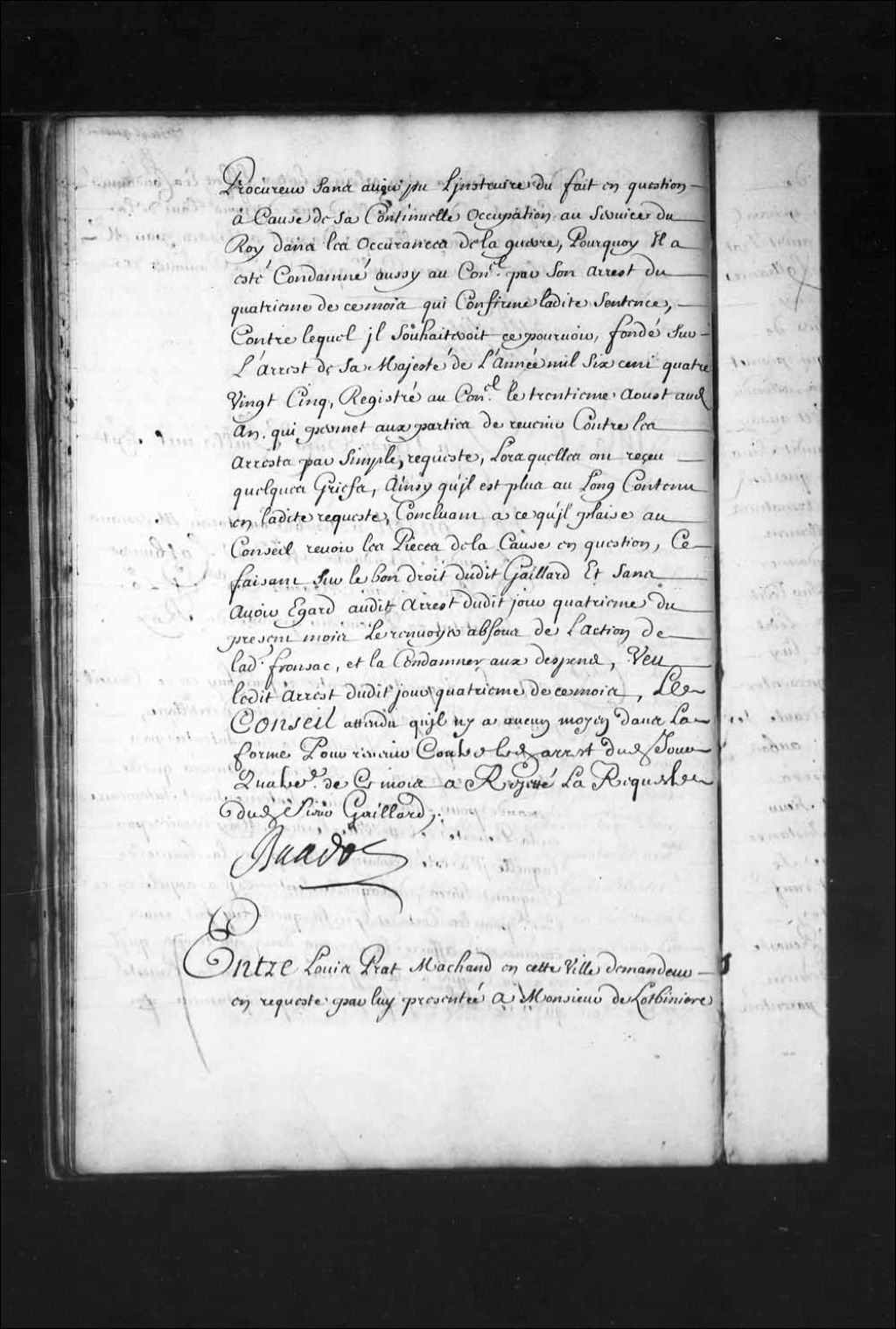 Transcription du texte avec orthographe modernisée : «Entre Louis Prat marchand en cette ville demandeur en requête par lui présentée à Monsieur de Lotbinière premier conseiller en ce Conseil et subdélégué de Monsieur l'intendant le vingt-neuvième juin dernier comparant par maître Jacques Barbel notaire en la prévôté de cette ville porteur de son pouvoir d'une part, et Jean MONJAUD dit Le Dragon maître et pilote du brigantin le Joybert appartenant audit Prat défendeur présent en personne d'autre part; vu une autre requête présentée par ledit Prat au lieutenant général de la prévôté et amirauté de cette ville, tendante pour les causes y contenues, à ce qu'il plût lui permettre de faire approcher par-devant lui a heure présente les sieurs de Beaubassin, Gaillard et Riverin au nom et comme armateurs et propriétaires du corsaire mouillé en la rade de cette ville, pour voir dire que défenses leur seront faites d'engager n'y embarquer sur ledit corsaire ledit Monjaud ni aucuns matelots de l'équipage dudit brigantin le Joybert, aux protestations que fait ledit Prat contre lesdits sieurs de Beaubassin, Gaillard, et Riverin desdits noms de les rendre responsables solidairement et un seul pour le tout de tous ses dommages, intérêts, et dépens soufferts et à souffrir, et de tout ce qu'il peut et doit de droit protester contre eux, ensemble ledit Monjaud pour se voir condamner aux dommages et intérêts dudit Prat suivant l'ordonnance de la marine, pour ne s'être pas icelui Monjaud acquitté de son devoir depuis son arrivée jusqu'à ce jour, et de remettre au suppliant le rôle de l'équipage, passeport et inventaire dudit brigantin, et à mettre ledit vaisseau en état de charge pour son retour audit lieu de Plaisance, ordonnance dudit lieutenant général du vingt-huitième juin dernier portant permis audit Prat de se pourvoir ou bon lui semblera attendu l'alliance qu'il y a entre ledit sieur de Beaubassin et lui, autre ordonnance du lieutenant particulier de ladite prévôté et amirauté du même jour, qui permet audit Prat de se pourvoir ou bon lui semblera, attendu que le lieutenant du corsaire est son fils; vu aussi ladite requête présentée par ledit Prat audit sieur de Lotbinière, contenant qu'ayant appris que lesdits sieurs de Beaubassin Gaillard, et Riverin armateurs et intéressés audit corsaire sollicitent journellement ledit Monjaud défendeur de quitter et abandonner ledit brigantin le Joybert, pour s'embarquer sur ledit corsaire, ce qui fait que depuis quelques jours ledit Monjaud a abandonné ledit brigantin sans lui rendre aucun compte, ce qui la obligé de présenter requête aux officiers de la prévôté et amirauté de cette ville, lesquels par leurs ordonnances au bas d'icelle le renvoient à se pourvoir où il avisera bon être, concluant à ce qu'il plaise audit sieur de Lotbinière prendre connaissance de ladite instance ou de nommer un juge devant lequel il puisse se pourvoir, ordonnance enfin d'icelle du vingt-neuvième juin dernier, par laquelle vu ladite requête, ensemble celle présentée aux officiers de ladite prévôté de cette ville au bas de laquelle est leur désistement du vingt-huitième dudit mois de juin causé pour parentés avec lesdits sieurs de Beaubassin et Dupuy, il est ordonné que ledit Prat se retirera par devers maître François Hazeur conseiller en ce Conseil lequel entendra les parties et examinera les pièces qui lui seront par elles produites, pour le tout par lui rapporté au Conseil le lundi suivant être fait et ordonné ce qu'il appartiendra, ordonnance dudit sieur Hazeur du 30e dudit mois de juin, par laquelle il déclare qu'il ne peut connaître du fait en question, ayant ouvert son sentiment la veille à ce sujet, autre ordonnance dudit sieur Hazeur du premier de ce mois par laquelle après avoir conféré et attendu qu'il n'a ouvert son sentiment qu'à une seule personne qui n'est point partie il lui a été dit qu'il pouvait en connaître suivant l'ordonnance dudit sieur de Lotbinière, pourquoi il a mandé ledit Prat pour lui rapporter ladite requête, il lui permet faire assigner lesdits sieurs de Beaubassin, Gaillard et Riverin ou un seul pour tous avec ledit Monjaud, en faisant signifier en même temps lesdites deux requêtes pour en venir le même jour par-devant lui en son hôtel deux heures de relevée pour répondre sur les faits mentionnés en icelles, signification desdites requêtes et ordonnances desdits sieurs de Lotbinière et Hazeur, auxdits sieurs Riverin tant pour lui que pour les autres propriétaires dudit corsaire, et Gaillard tant pour lui que pour les autres armateurs dudit corsaire avec assignation à eux à comparaître par-devant ledit sieur Hazeur ledit jour premier de ce mois deux heures de relevée, procès-verbal fait ledit jour premier de ce mois par ledit sieur Hazeur, contenant la comparution, et dires des parties et son ordonnance qu'il serait par lui rapporté le lundi suivant quatrième de ce mois auquel jour les parties comparaîtraient en ce Conseil, signification dudit procès-verbal par de la Rivière huissier en ce Conseil le deuxième de ce dit mois, à la requête dudit Prat audit sieur Gaillard pour lesdits armateurs et propriétaires, et audit Monjaud, avec déclaration que ledit Prat se trouverait le lundi suivant en ce Conseil à ce qu'ils eussent à s'y trouver si bon leur semblerait, requête présentée audit lieutenant général de la prévôté et amirauté de cette ville par ledit Monjaud ledit jour deuxième de ce mois, tendante à ce qu'il lui fut permis de faire assigner ledit Prat a heure présente pour se voir condamner à compter avec lui du jour de son départ de cette ville pour le voyage de Plaisance jusqu'au jour qu'il l'aura pleinement satisfait à raison de cinquante livres de France par mois et lui payer les sommes dont il se trouvera redevable après ledit compte fait, ou lui payer quarante jours de traversée, et les vivres 