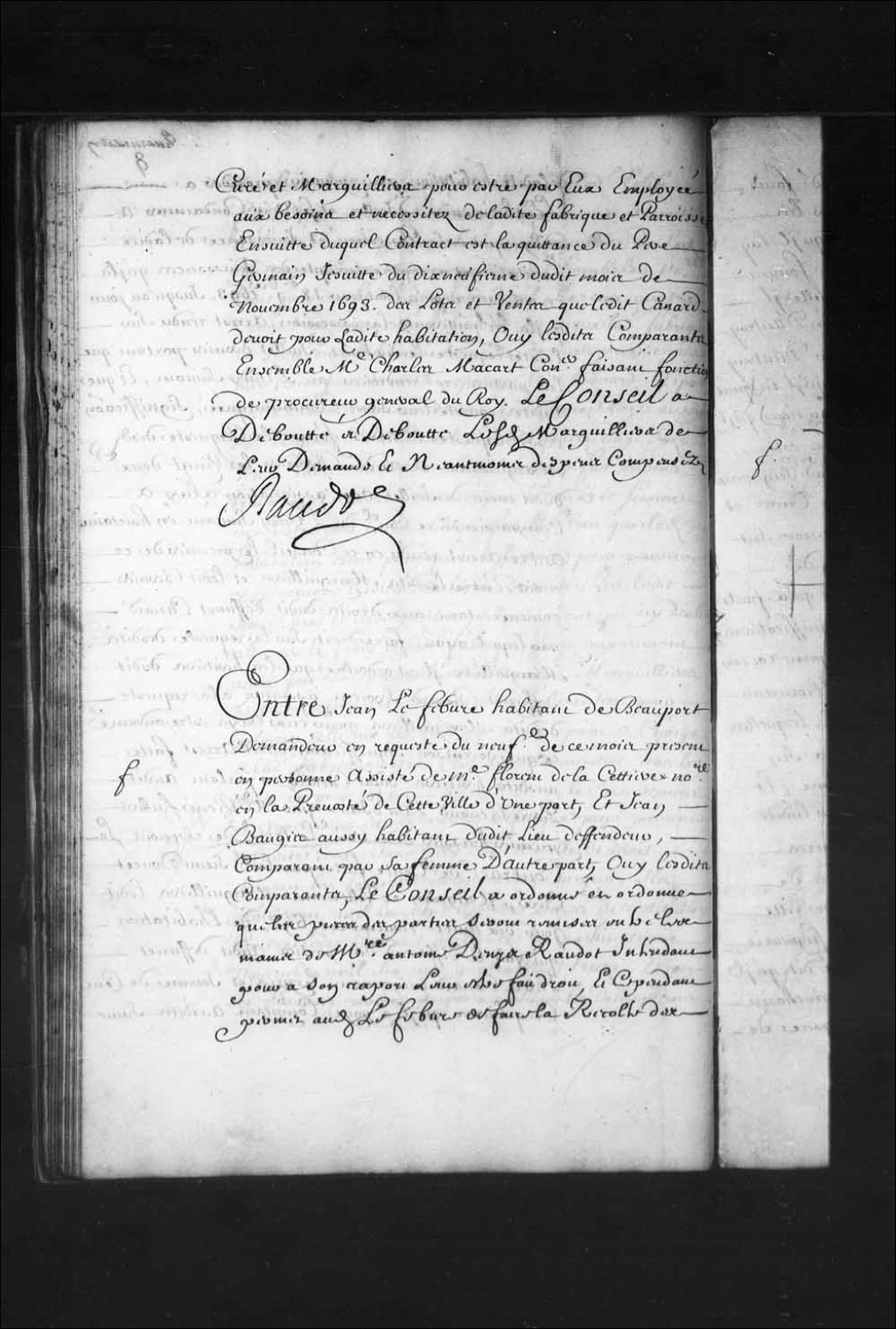 - Transcription du texte avec orthographe modernisée : «Entre Jean Lefebvre habitant de Beauport demandeur en requête du neuvième de ce mois présent en personne assisté de maître Florent de LaCettière (Lacetière) notaire en la prévôté de cette ville d'une part, et Jean BAUGIS (Baugy, Bougie) aussi habitant dudit lieu défendeur, comparant par sa femme d'autre part, ouï lesdits comparants, le Conseil a ordonné et ordonne que les pièces des parties seront remises entre les mains de maître Antoine Denis Raudot intendant pour à son rapport leur être fait droit, et cependant permet audit Lefebvre de faire la récolte des foins et lins qui sont sur la terre dudit Baugis en présence dudit Beaugis ou lui dûment appelé de laquelle récolte ledit Lefebvre tiendra compte audit Baugis si faire se doit. RAUDOT.»