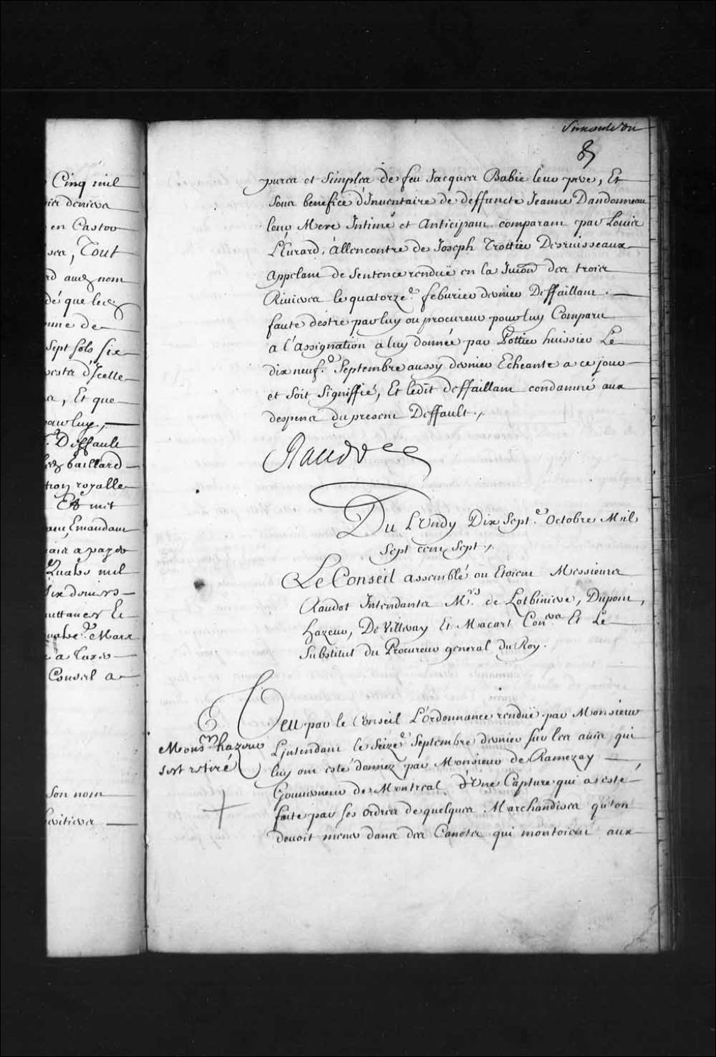 - Transcription du texte avec orthographe modernisée : «Du lundi dix-septième octobre mille sept cent sept. Le Conseil assemblé où étaient Messieurs Raudot intendants Messieurs de Lotbinière, Dupont, Hazeur, de Villeray et Macart (Macard) conseillers et le substitut du procureur général du Roi. Monsieur Hazeur s'est retiré. Vu par le Conseil l'ordonnance rendue par Monsieur l'intendant le seizième septembre dernier sur les avis qui lui ont été donnés par Monsieur de Ramezay gouverneur de Montréal d'une capture qui a été faite par ses ordres de quelques marchandises qu'on devait mener dans des canots qui montaient aux Outaouais, et sur la copie d'une lettre à lui envoyée écrite par Jean Soumande marchand à Montréal au nommé Reaume qui contient une facture des marchandises qu'il lui envoyait, par laquelle ces sortes de commerces étant défendus par les déclarations et ordres du Roi, il est ordonné audit Soumande de descendre en cette ville [...]