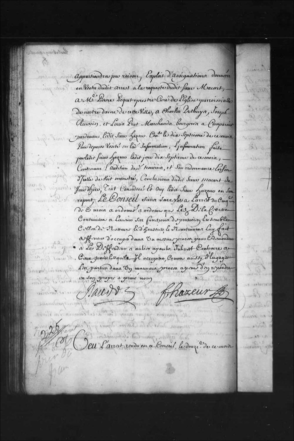 - Transcription du texte avec orthographe modernisée : «Vu l'arrêt rendu en ce Conseil le douzième de ce mois sur autre arrêt rendu en icelui le cinquième de ce dit mois portant que la requête des boulangers de cette ville, les règlements de police, et arrêts rendus au sujet de la boulangerie, ensemble un écrit par eux présenté ledit jour seraient mis en les mains de maître René Louis Chartier de Lotbinière premier conseiller pour à son rapport être par le Conseil ordonné ce jourd'hui ce qu'il appartiendra par raison et cependant ayant égard au réquisitoire de maître Charles Macart (Macard) conseiller faisant les fonctions de procureur général du Roi, défenses à tous marchands négociants et autres personnes de quelque qualité et condition qu'elles soient de faire sortir à l'avenir de ce pays aucuns blés, farines ni biscuits à peine de confiscation et de cent livres d'amende, et à ce que personne n'en pût ignorer que ledit arrêt serait à [...]