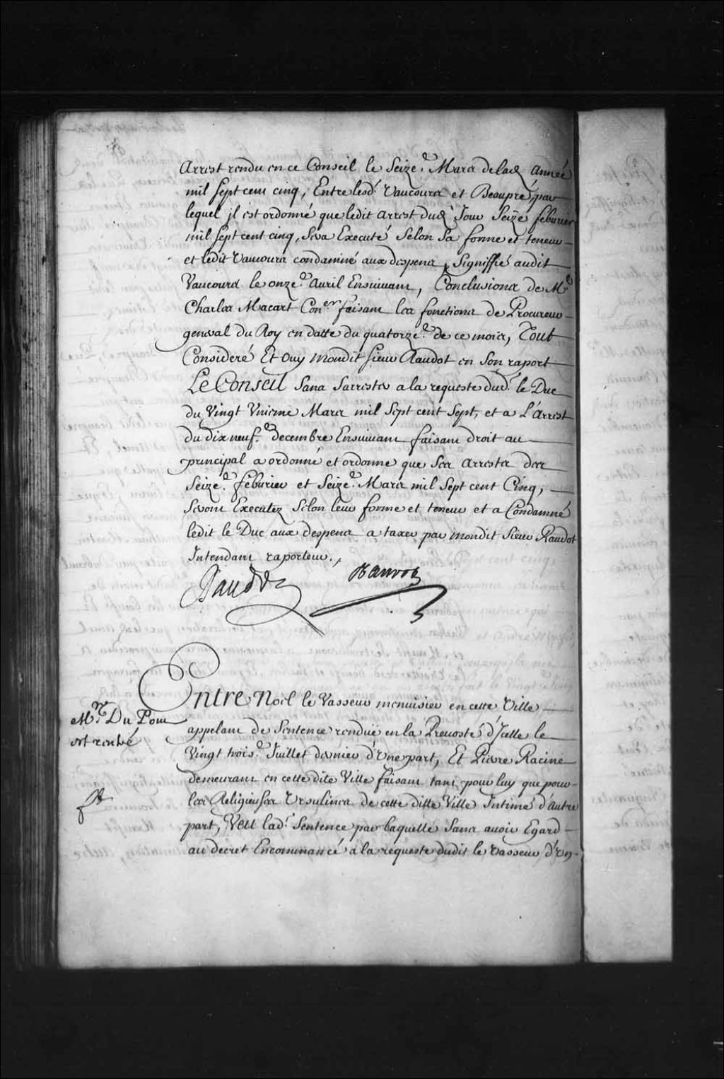 - Transcription du texte avec orthographe modernisée : «Monsieur DuPont est rentré. Entre Noël LEVASSEUR menuisier en cette ville appelant de sentence rendue en la prévôté d'icelle le vingt-troisième juillet dernier d'une part, et Pierre RACINE demeurant en cette dite ville faisant tant pour lui due pour les religieuses ursulines de cette dite ville intimé d'autre part, vu ladite sentence par laquelle sans avoir égard au décret encommencé à la requête dudit Levasseur d'un emplacement situé sur la rue des Jardins appartenant à la communauté d'entre lui et défunte Marguerite Guay, les causes d'oppositions audit décret faites par ledit Racine desdits noms sont déclarées bonnes et valables, et en conséquence ledit Levasseur débouté de la poursuite d'icelui en plus outre si mieux n'aime faire donner bonne et suffisante décharge par les représentants défunt François Hurault aux dites religieuses ursulines et audit Racine de tous les hypothèques qu'ils pourraient avoir et prétendre sur tout l'emplacement et maison construite dessus qui ont appartenu audit défunt Hurault, auquel cas ledit décret pourra être parachevé, et ledit Levasseur condamné aux dépens de l'instance, signification de ladite sentence faite à la requête dudit Levasseur audit Racine auxdits noms, avec déclaration qu'il est appelant d'icelle le huitième octobre dernier, requête présentée en ce Conseil par ledit Levasseur aux fins d'être reçu à sondit appel, l'ordonnance enfin d'icelle qui le reçoit appelant et lui permet de faire assigner à jour compétent en date dudit jour huitième octobre, signification desdites requête et ordonnance faite le même jour à la requête dudit Levasseur audit Racine auxdits noms, avec assignation à comparaître en ce Conseil du lundi suivant en huitaine, arrêt rendu en ce Conseil le dix-septième dudit mois, par lequel les parties sont appointées à fournir de griefs et de réponses a griefs dans les délais de l'ordonnance par-devant maître Charles Macart (Macard) conseiller pour à son rapport leur être fait droit ainsi que de raison, signification dudit arrêt faite à la requête dudit Levasseur audit Racine desdits noms le vingt-sixième novembre aussi dernier, avec sommation de satisfaire au contenu en icelui, griefs et moyens d'appel fournis par ledit Levasseur, et signifiées à sa requête audit Racine auxdits noms le vingt-deuxième dudit mois d'octobre, requête présentée à Monsieur l'intendant par ledit Levasseur à ce qu'il lui plût commettre tel autre conseiller pour rapporteur à la place dudit sieur Macart (Macard), l'ordonnance de mondit sieur l'intendant du vingt-cinquième dudit mois de novembre par laquelle maître François Mathieu Martin Delino (De Lino) conseiller est commis pour rapporteur en la place dudit sieur Macart (Macard), signification desdites requête et ordonnance faite ledit jour vingt-sixième novembre à la requête dudit Levasseur audit Racine auxdits noms avec déclaration que ledit Levasseur produira incessamment entre les mains dudit sieur Delino (De Lino) les pièces dont il entend se servir à ce que ledit Racine desdits noms ait à faire le semblable, réponses aux griefs dudit Levasseur fournies par ledit Racine desdits noms, signifiées à sa requête audit Levasseur le sixième décembre aussi dernier, répliques fournies par ledit Levasseur, et signifiées à sa requête audit Racine desdits noms le dixième dudit mois de décembre, réponses aux dites répliques fournies par ledit Racine desdits noms et signifiées à sa requête audit Levasseur le vingt-huitième dudit mois de décembre un contrat de concession faite par lesdites religieuses ursulines à maître Claude de Bermen conseiller du Roi et son lieutenant général au siège de ladite prévôté de cette ville en date du sixième septembre mille s'il cent soixante-quatorze d'un emplacement de terre situé en cette ville sur la rue Saint-Louis, contenant cinquante-neuf pieds de front sur ladite rue et soixante-neuf pieds de profondeur, un contrat de vente faite le trente et unième mai mille six cent quatre-vingt-huit par défunt maître Charles Aubert de Lachesnaie vivant conseiller en ce Conseil audit François Hurault de l'emplacement ci-dessus désigné avec une masure qui était dessus consistant en quatre pans de muraille restée de l'incendie d'une maison qui était auparavant, ensemble les clôtures pièces et pieux étant sur ledit emplacement qui appartenait audit feu sieur de Lachesnaie (Lachesnaye) par contrat de vente que lui en avait faite ledit sieur de La Martinière passé par-devant Genaple notaire le vingt-septième avril mille six cent quatre-vingt-sept, un autre contrat de vente faite le troisième mars mille six cent quatre-vingt-quatorze, par lequel ledit Levasseur vend aux dites religieuses ursulines et promet garantir de tous troubles et empêchements généralement quelconques, un emplacement d'environ seize ou vingt pieds de large plus ou moins sur environ trente-quatre ou trente-cinq de long aussi plus ou moins, ledit emplacement situé à la haute-ville et faisant partie d'un plus grand par lui acquis dudit Hurault, autre contrat de vente faite par ledit Levasseur le huitième septembre mille six cent quatre-vingt-quinze à Claude Pon avec garantie de tous troubles, d'un emplacement de terre situé à ladite haute-ville rue Saint-Louis contenant vingt et un pieds de face sur ladite rue et de profondeur ce qui ce trouvera jusqu'à la grange desdites religieuses ursulines, ledit emplacement faisant partie d'un plus grand par lui acquis dudit Hurault, autre contrat de vente faite le quatorzième mars mille sept cent, par ledit Claude Pon et Marguerite Douzon sa femme audit Racine de l'emplacement spécifié ci-dessus, un billet sous Seing privé signé Rousselot en date du dixième octobre dernier, par lequel il paraît que ledit Rousselot consent que ledit Levasseur vende une maison et emplacement qu'il