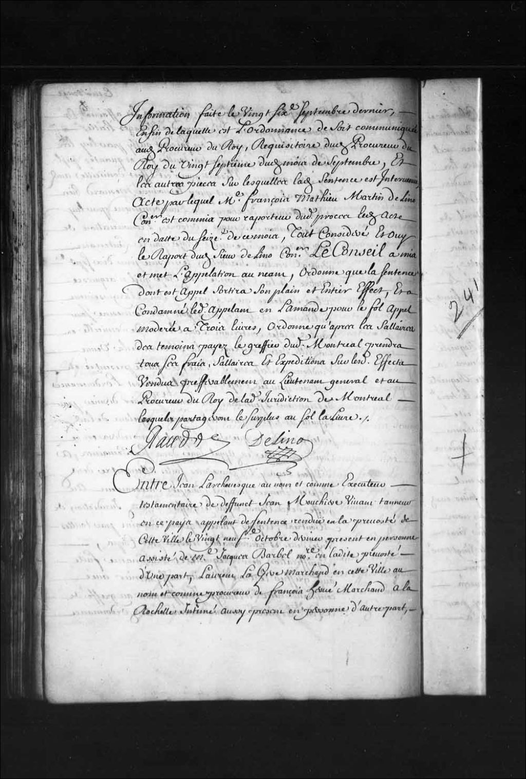 Arrêt prorogeant les assignations données dans la cause de Jean L'archevêque, en son nom et comme exécuteur testamentaire du défunt Jean Mouchère, contre Laurent Lagère, marchand de Québec, en son nom et comme procureur de François Hervé, marchand de La Rochelle, et Florent de la Cettière (LaCetière), notaire en la Prévôté de Québec, jusqu'à mardi prochain, 21 mars 1708, Archives nationales à Québec, Fonds Conseil souverain, (03Q,TP1,S28,P8622).