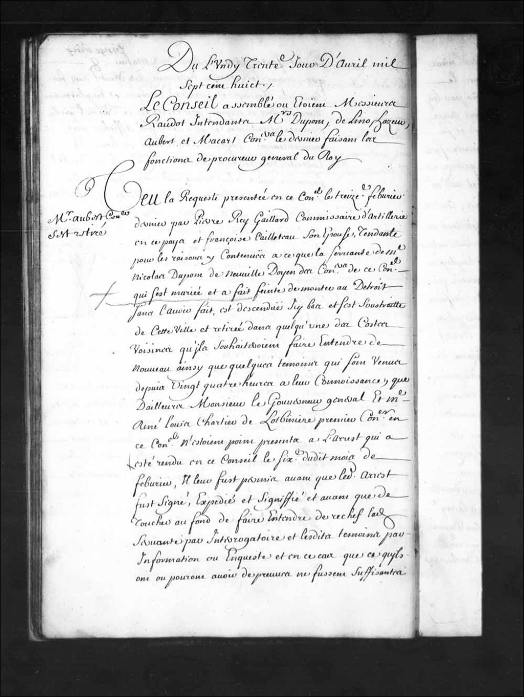 Transcription du texte avec orthographe modernisée : «Du lundi trentième jour d'avril mille sept cent huit. Le Conseil assemblé où étaient Messieurs Raudot intendants Messieurs Dupont, Delino (De Lino), Hazeur, Aubert et Macart (Macard) conseillers le dernier faisant les fonctions de procureur général du Roi. Monsieur Hubert conseiller s'est retiré. Vu la requête présentée en ce Conseil le treizième février dernier par Pierre Rey Gaillard commissaire d'artillerie en ce pays et Françoise Cailleteau son épouse, tendante pour les raisons y contenues à ce que la servante de maître Nicolas Dupont de Neuville doyen des conseillers de ce Conseil qui s'est mariée et a fait feinte de monter au Détroit sans l'avoir fait, est descendue ici bas et s'est soustraite de cette ville et retirée dans quelqu'une des côtes voisines qu'ils souhaiteraient faire entendre de Nouveau ainsi que quelques témoins qui sont venus depuis vingt-quatre heures à leur [...]