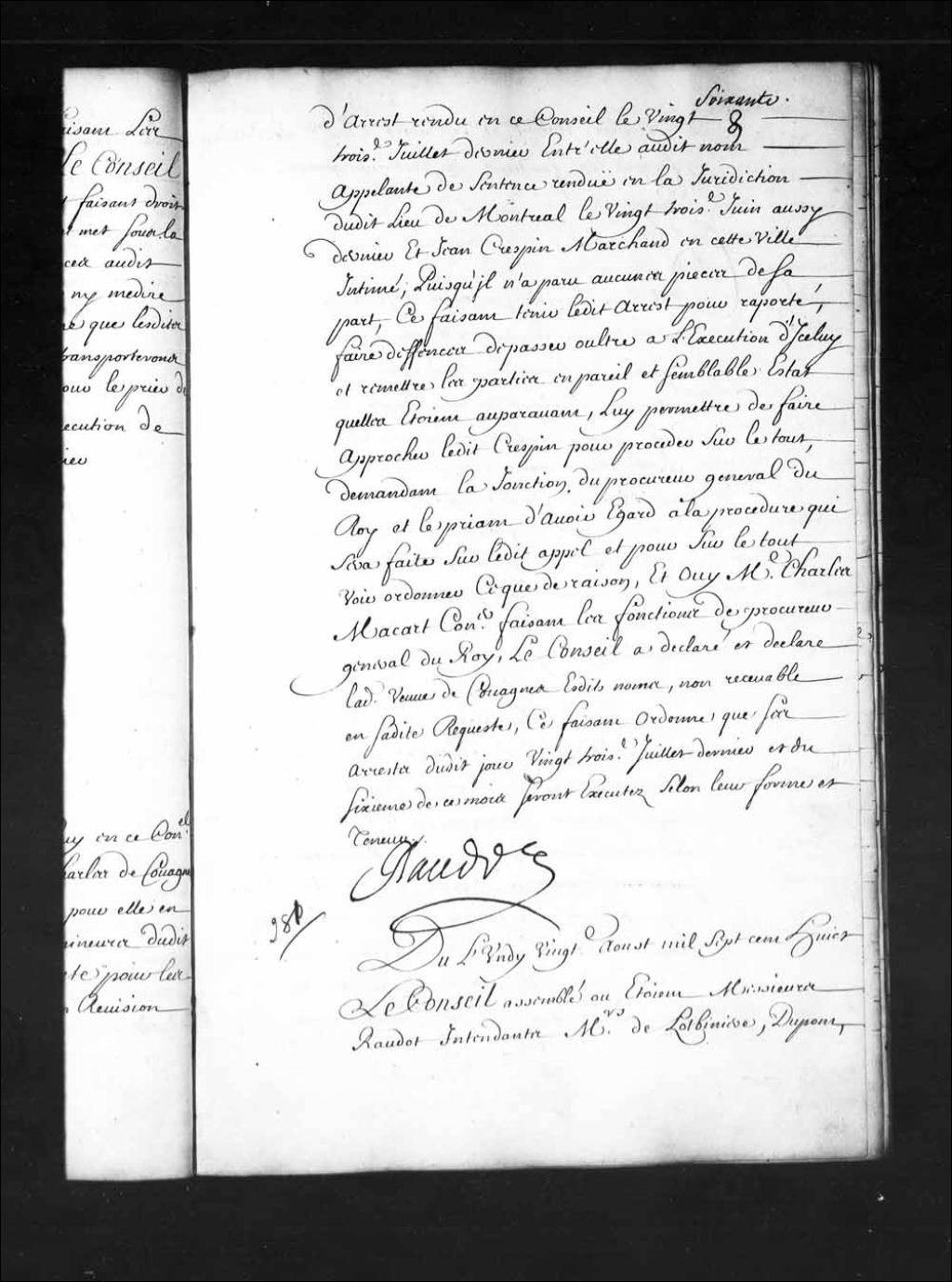 Transcription du texte avec orthographe modernisée : «Du lundi vingtième août mille sept cent huit. Le Conseil assemblé où étaient Messieurs Raudot intendants Messieurs de Lotbinière, Dupont, Delino (De Lino), Aubert, et Macart (Macard) conseillers le dernier faisant les fonctions de procureur général du Roi. Vu la requête présentée ce jourd'hui en ce Conseil par Guillaume Jourdain maçon demeurant en la seigneurie de Lauson (Lauzon), tendante pour les raisons y contenues à ce que vu un compte arbitral du vingt-cinquième septembre mille six cent quatre-vingt-dix-huit, et une obligation passée le vingt-cinquième octobre ensuivant ensemble les comptes des payements et retours que ledit Jourdain a faits à François Blancheteau marchand de La Rochelle sur les cargaisons par lui envoyées, celui des erreurs de trop et moins compté au désavantage dudit Jourdain sur ledit compte arbitral et par ladite obligation, et celui des injustes payements que ledit Jourdain a faits à Nicolas Pinaud (Pineau) marchand en cette ville comme procureur dudit Blancheteau et de Gilles Moynereau (Moinereau) aussi marchand de La Rochelle étant aux droits dudit Blancheteau sur ladite obligation, lesquels trois derniers comptes prouvent Clairement que ledit Jourdain ne doit rien audit Blancheteau ni audit Moynereau son cessionnaire, et qu'au contraire ledit Pinaud lui a fait payer la somme de trois mille six cent soixante-sept livres dix-huit sols quatre deniers monnaie de France plus qu'il ne devait, ce qui fait voir une lésion énorme et une tromperie manifeste que ledit Jourdain n'a pu connaître jusqu'à présent faute d'expérience suffisante au fait du commerce il plaise à la Cour le recevoir appelant dudit compte arbitral, le restituer contre la signature qu'il a donnée pour l'approbation dudit compte arbitral comme fait par surprise, sans savoir si lesdits arbitres y avaient fait erreur ou non à son désavantage, et contre ladite obligation comme faite et consentie par lesdits Jourdain et sa femme, pour une somme qui n'est qu'en la moindre partie due et par la surprise, dol, fraude et menaces dudit Blancheteau, et lui accorder lettres à ce nécessaires, et à cette fin lui permettre de faire assigner ledit Pinaud desdits noms pour ce voir condamner et par corps à rendre et restituer audit Jourdain ladite somme de trois mille six cent soixante-sept livres dix-huit sols sept deniers monnaie de France par lui trop reçue, et en tous ses dépens dommages et intérêts soufferts et à souffrir, ouï maître Charles Macart (Macard) conseiller faisant les fonctions de procureur général du Roi, le Conseil avant faire droit sur l'appel dudit compte arbitral et sur les autres demandes dudit Jourdain a ordonné et ordonne qu'il sera délivré lettres de restitution audit Jourdain par le greffier en chef de ce Conseil adressantes en ce dit Conseil lesquelles seront jointes audit appel et aux dites demandes pour en plaidant y avoir tel égard que de raison. RAUDOT.»