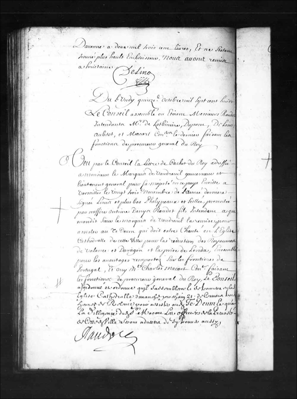 Transcription du texte avec orthographe modernisée : «Du lundi quinzième octobre mille sept cent huit. Le Conseil assemblé où étaient Messieurs Raudot intendants Messieurs de Lotbinière, Dupont, Delino (De Lino), Aubert, et Macart (Macard) conseillers ce dernier faisant les fonctions de procureur général du Roi. Vu par le Conseil la lettre de cachet au Roi adressée à Monsieur le marquis de Vaudreuil gouverneur et lieutenant général pour sa majesté en ce pays écrite à Versailles le vingt-troisième novembre de l'année dernière signée Louis et plus bas Phelypeaux et scellée, présentée par messire Antoine Denis Raudot fils intendant à qui mondit sieur le marquis de Vaudreuil la remise, pour assister au Te Deum qui doit être chanté en l'église cathédrale de cette ville pour la réduction des royaumes de Valance (Valence) et Daragon (D'Aragon) et la prise de Lerida, ensemble pour les avantages remportés sur les frontières de Portugal, et ouï [...]