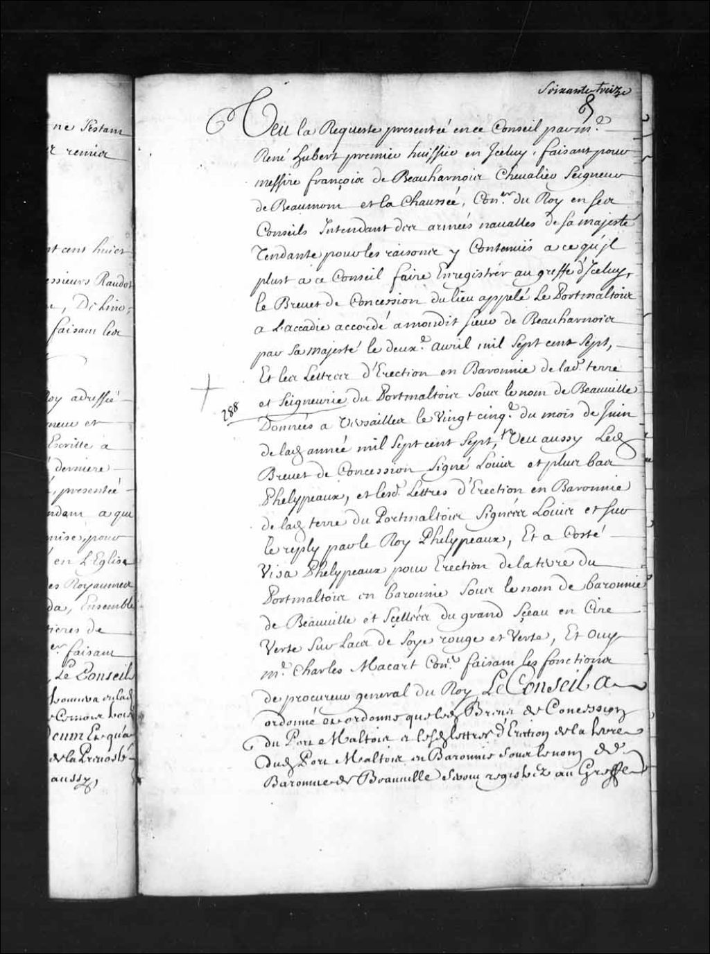 - Ordre d'enregistrer au greffe du Conseil le brevet de concession du Port-Maltais en Acadie et les lettres d'érection de la terre du dit lieu en baronnie sous le nom de baronnie de Beauville, afin que François de Beauharnois, Chevalier seigneur de LaBoische, Baron de Beauville et conseiller du Roi, et ses héritiers puissent en jouir