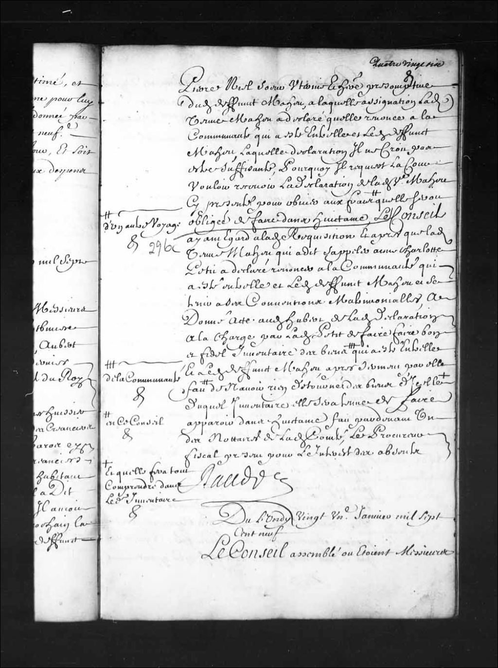 Transcription du texte avec orthographe modernisée : «Du lundi vingt et unième janvier mille sept cent neuf. Le Conseil assemblé où étaient Messieurs Raudot intendants Messieurs de Lotbinière, Dupont, Delino (De Lino), la Colombière, de Ladurantaye, Aubert, de Villeray, et Macart (Macard) conseillers le dernier faisant les fonctions de procureur général du Roi. Vu par le Conseil la requête présentée à messire Antoine Denis Raudot intendant par Guillaume Jourdain maçon demeurant en la seigneurie de Lauson demandeur en entérinement de lettres de restitution par lui obtenues à l'encontre de Nicolas Pinaud (Pineau, Pinault) marchand en cette ville au nom et comme procureur de François Blancheteau et Gilles Moynereau (Monnereau, Moinereau) référée en ce dit Conseil par mondit sieur Raudot, contenante que ledit Jourdain a remarqué que ledit Pinaud par l'interrogatoire sur faits et articles qu'il a subi par-devant mondit sieur Raudot le [...]