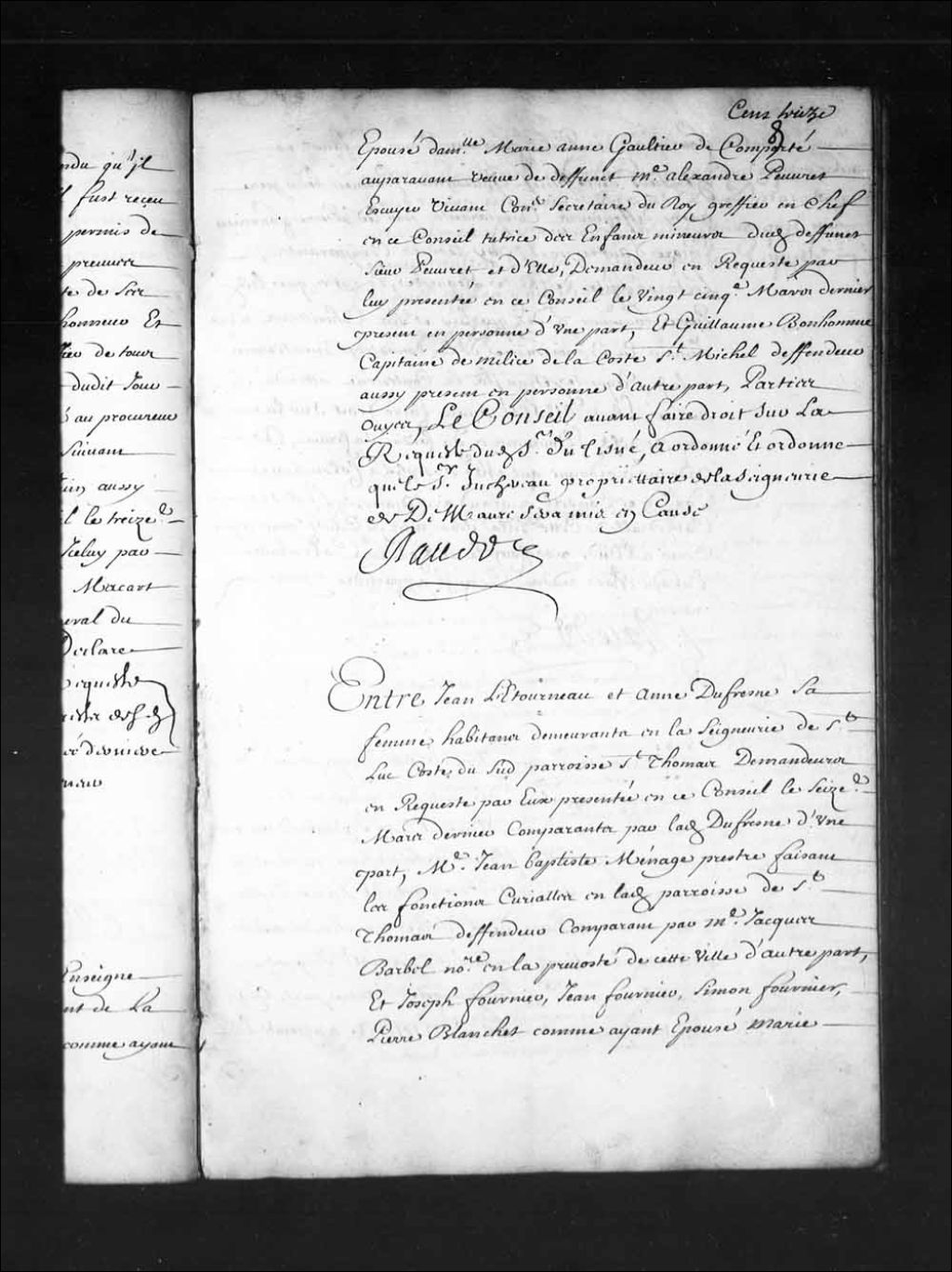 Transcription du texte avec orthographe modernisée : «Entre Jean Létourneau et Anne DUFRESNE sa femme habitant demeurants en la seigneurie de Saint-Luc côte du sud paroisse Saint-Thomas demandeurs en requête par eux présentée en ce Conseil le seizième mars dernier comparants par ladite Dufresne d'une part, messire Jean-Baptiste MÉNAGE prêtre faisant les fonctions curiales en ladite paroisse de Saint-Thomas défendeur comparant par maître Jacques Barbel notaire en la prévôté de cette ville d'autre part, et Joseph FOURNIER, Jean FOURNIER, Simon FOURNIER, Pierre BLANCHET comme ayant épousé Marie Fournier, et Pierre FOURNIER tous enfants et héritiers de défunt Guillaume Fournier leur père aussi défendeurs comparants par ledit Pierre Fournier encore d'autre part, ouï lesdits comparants, lecture faite de ladite requête, et après que ledit Pierre Fournier a dit que lui et ses cohéritiers n'ont jamais eu connaissance de la donation mentionnée en ladite requête, et qu'ils la contestent attendu sa nullité, le Conseil avant faire droit sur la requête desdits Létourneau et Dufresne sa femme, a ordonné et ordonne que maître Joseph la Colombière conseiller en ce Conseil et grand archidiacre en l'église cathédrale de cette ville sera mis en cause pour en venir à lundi prochain et ledit sieur la Colombière entendu être ordonné ce qu'il appartiendra par raison. RAUDOT.»