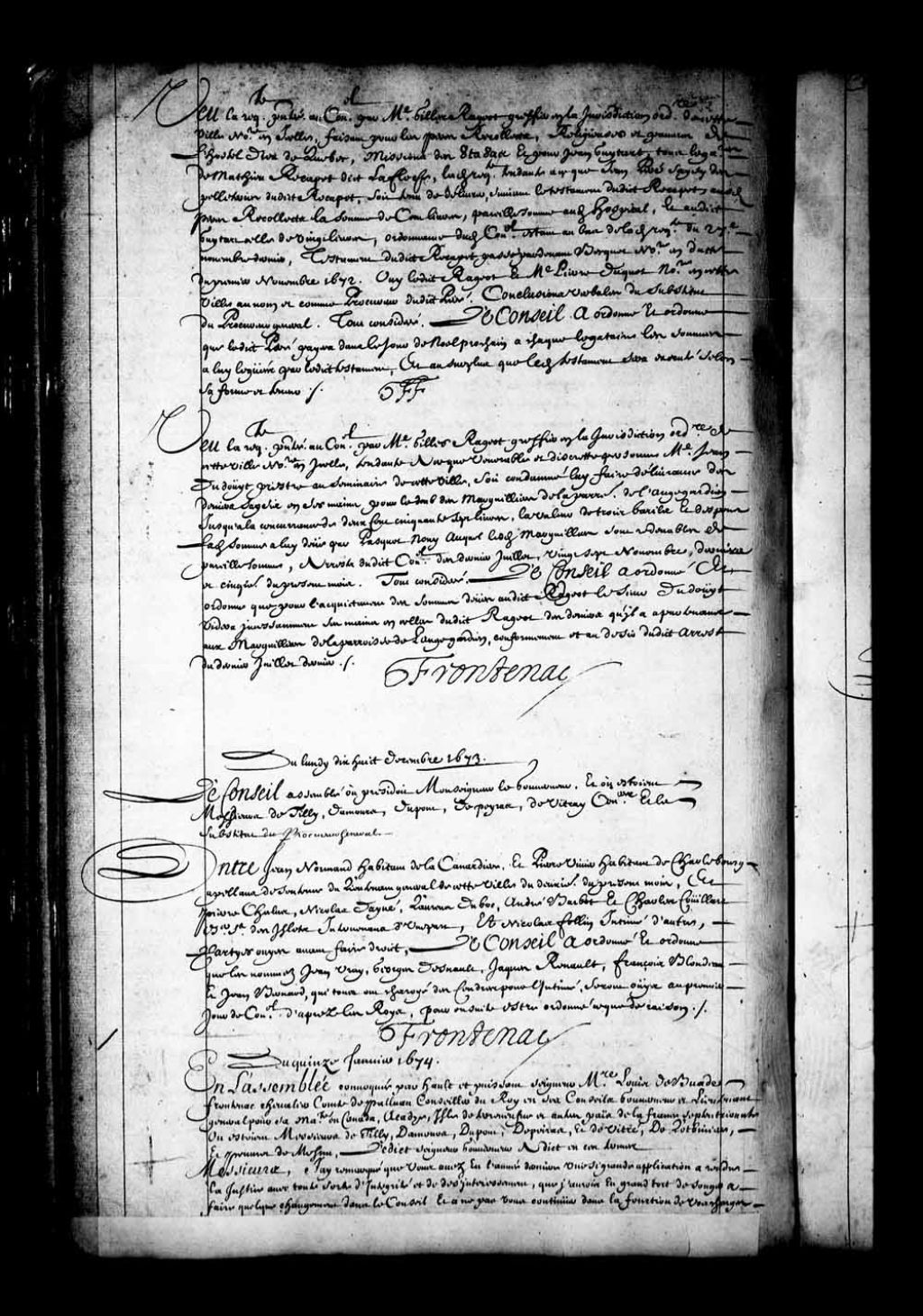 - Transcription du texte avec orthographe modernisée : «Vu la requête présentée au Conseil par maître Gilles Rageot greffier en la juridiction ordinaire de cette ville, notaire en icelle, faisant pour les pères récollets, religieuses et pauvres de l'Hôtel-Dieu de Québec, missions des Outaouas et pour Jean Guytart, tous légataires de Mathieu Recapet dit LaCloche, ladite requête tendante à ce que Jean Peré saisi des pelleteries dudit Recapet, soit tenu de délivrer, suivant le testament dudit Recapet auxdits pères récollets la somme de cent livres, pareille somme audit Hôpital, et audit Guytart celle de vingt livres; ordonnance dudit Conseil étant au bas de ladite requête du vingt-septième novembre dernier; testament dudit Recapet passé par-devant Becquet notaire en date du premier novembre 1672; ouï ledit Rageot et maître Pierre Duquet notaire en cette ville, au nom et comme procureur dudit Peré; conclusions verbales du substitut du procureur général, tout considéré, le Conseil a ordonné et ordonne que ledit Peré payera dans le jour de Noël prochain à chaque légataire les sommes à lui léguées par ledit testament, et au surplus que ledit testament sera exécuté selon sa forme et teneur. FF.»