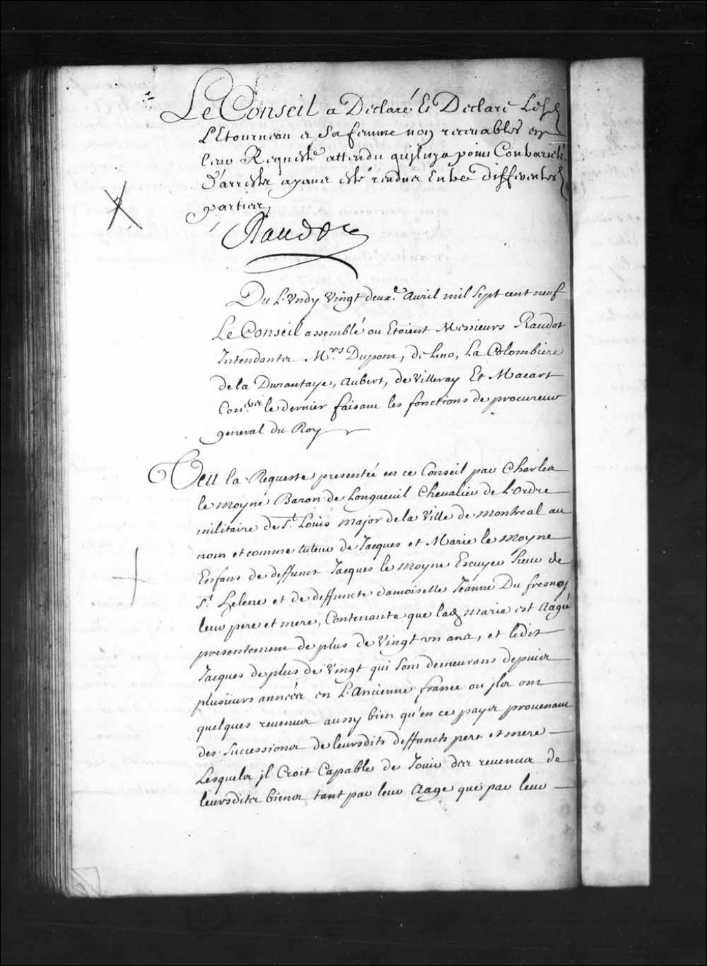 - Transcription du texte avec orthographe modernisée : «Du lundi vingt-deuxième avril mille sept cent neuf. Le Conseil assemblé où étaient Messieurs Raudot intendants Messieurs Dupont, Delino (De Lino), la Colombière (Lacolombière) de Ladurantaye, Aubert, de Villeray et Macart (Macard) conseillers le dernier faisant les fonctions de procureur général du Roi. Vu la requête présentée en ce Conseil par Charles Lemoyne (Lemoine) baron de Longueuil chevalier de l'ordre militaire de Saint-Louis major de la ville de Montréal au nom et comme tuteur de Jacques et Marie Lemoyne enfants de défunt Jacques Lemoyne écuyer sieur de Saint-Hélène et de défunte demoiselle Jeanne Dufresnoy leur père et mère; contenante que ladite Marie est âgée présentement de plus de vingt et un ans, et ledit Jacques de plus de vingt qui sont demeurant depuis plusieurs années en l'ancienne France où ils ont quelques revenus aussi bien qu'en ce pays provenant des [...]