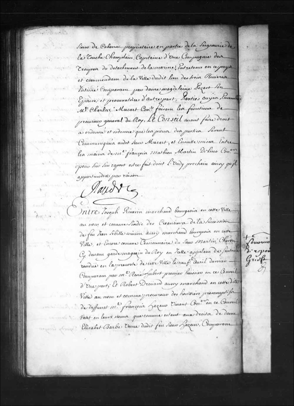 - Transcription du texte avec orthographe modernisée : «Entre Joseph RIVERIN marchand bourgeois en cette ville au nom et comme syndic des créanciers de la succession de feu Jean Sebille vivant aussi marchand bourgeois en cette ville, et encore comme cessionnaire du sieur Martin Cheron ci-devant garde magasin du Roi en icelle appelant de sentence rendue en la prévôté de cette ville le neuvième avril dernier comparant par maître René Hubert premier huissier en ce Conseil d'une part: et Robert DROUARD aussi marchand en cette dite ville au nom et comme procureur des héritiers présomptifs de défunt maître François Hazeur vivant conseiller en ce Conseil tant en leurs noms que comme étant aux droits de dame Elisabeth Barbe veuve dudit feu sieur Hazeur, comparant par messire Pierre Hazeur Delorme prêtre curé de Champlain l'un desdits héritiers intimé d'autre part, ouï lesdits comparants, le Conseil a ordonné et ordonne que les parties en [...]