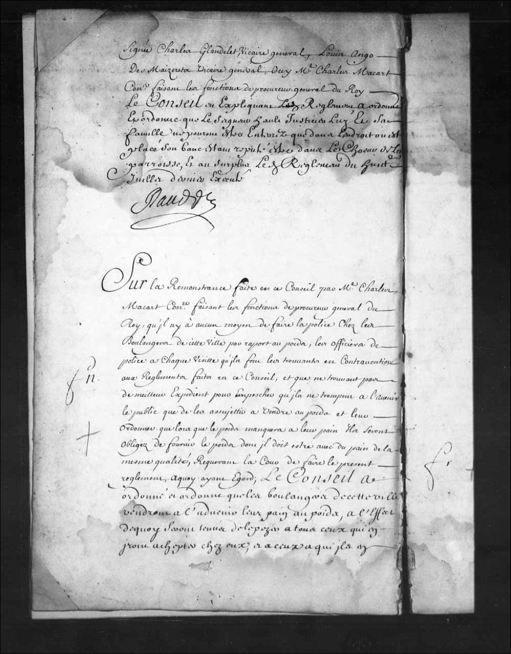 - Transcription du texte avec orthographe modernisée : «Sur la remontrance faite en ce Conseil par maître Charles Macart (Macard) conseiller faisant les fonctions de procureur général du Roi, qu'il n'y a aucun moyen de faire la police chez les boulangers de cette ville par rapport au poids, les officiers de police à chaque visite qu'ils font les trouvant en contravention aux règlements faits en ce Conseil, et que ne trouvant pas de meilleur expédient pour empêcher qu'ils ne trompent à l'avenir le public que de les assujettir à vendre au poids et leur ordonner que lorsque le poids manquera à leur pain Ils seront obligés de fournir le poids dont il doit être avec du pain de la même qualité, requérant la Cour de faire le présent règlement, à quoi ayant égard; le Conseil a ordonné et ordonne que les boulangers de cette ville vendront à l'avenir leur pain au poids, à l'effet de quoi seront tenus de le peser à tous ceux qui en iront acheter [...]
