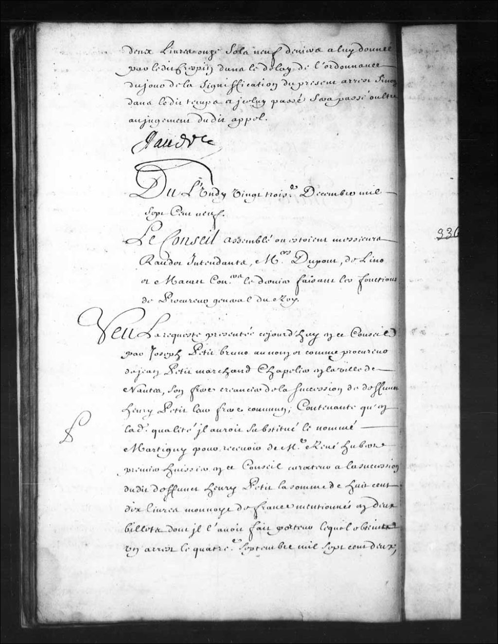 - Transcription du texte avec orthographe modernisée : «Du lundi vingt-troisième décembre mille sept cent neuf. Le Conseil assemblé où étaient messieurs Raudot intendants, Messieurs Dupont, Delino (De Lino) et Macart (Macard) conseillers le dernier faisant les fonctions de procureur général du Roi. Vu la requête présentée ce jourd'hui en ce Conseil par Joseph Petit BRUNO (Bruneau) au nom et comme procureur de Jean Petit marchand chapelier en la ville de Nantes, son frère créancier de la succession de défunt Henri Petit leur frère commun, contenante qu'en ladite qualité il aurait substitué le nommé Martigny pour recevoir de maître René Hubert premier huissier en ce Conseil curateur à la succession dudit défunt Henri Petit la somme de huit cent dix livres monnaie de France mentionnée en deux billets dont il l'avait fait porteur lequel obtint un arrêt le quatrième septembre mille sept cent deux; contre ledit Hubert par lequel il est condamné [...]