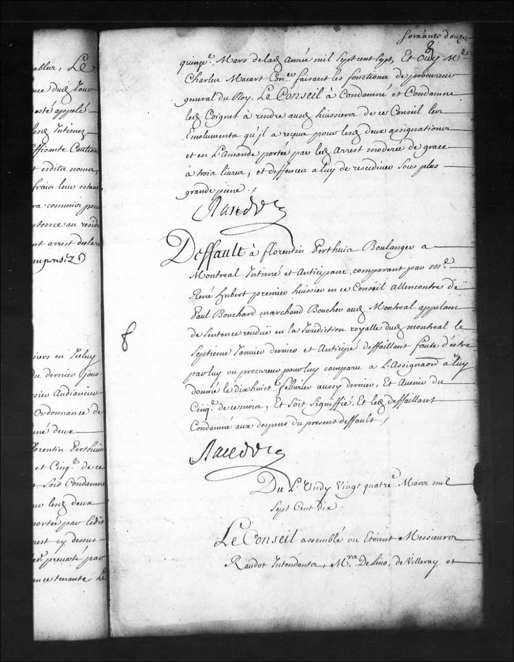 Transcription du texte avec orthographe modernisée : «Du lundi vingt-quatrième mars mille sept cent dix. Le Conseil assemblé où étaient Messieurs Raudot intendants, Messieurs Delino (De Lino), de Villeray et Macart (Macard) conseillers et maître Paul Denys (Denis) de Saint-Simon prévôt de la maréchaussée, ledit sieur Macart (Macard) faisant les fonctions de procureur général du Roi. Sur le réquisitoire de maître Charles Macart (Macard) conseiller faisant les fonctions de procureur général du Roi en date de ce jour contenant que le procureur du Roi en la prévôté de cette ville l'aurait prié de représenter à ce Conseil qu'il faisait souvent la visite des cheminées et en trouvait souvent de Salles par la négligence des propriétaires et locataires des maisons de cette dite ville, comme aussi que les menuisiers et tonneliers faisaient des amas de ripes et copeaux qui pourraient causer un incendie, pourquoi il requiert que les propriétaires [...]