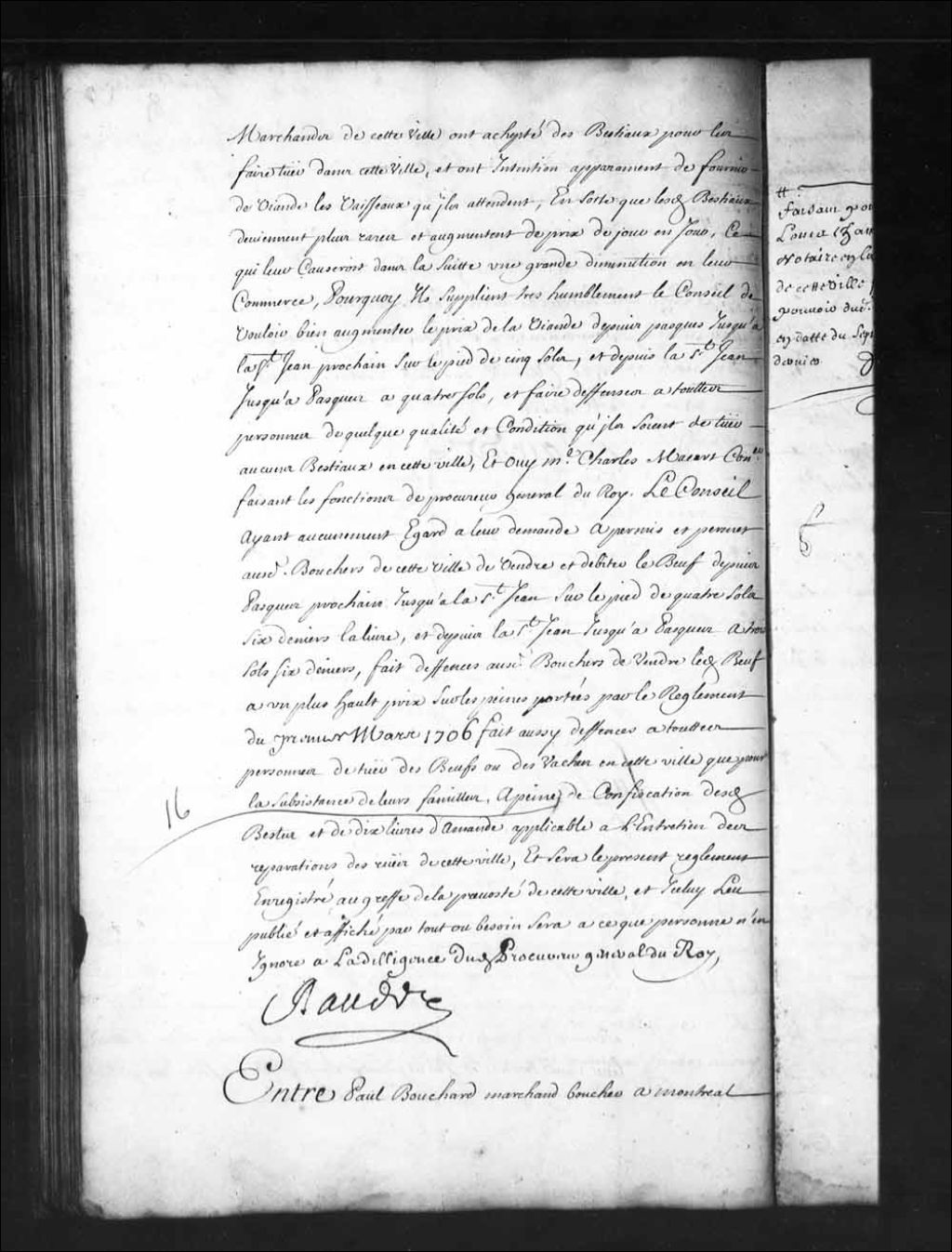 - Transcription du texte avec orthographe modernisée : «Entre Paul BOUCHARD marchand boucher à Montréal appelant de sentences rendues en la juridiction royale dudit Montréal les treizième décembre et septième janvier derniers et anticipé comparant par René Claude Barrollet (Barolet) praticien faisant pour maître Louis Chambalon notaire en la prévôté de cette ville fondé du pouvoir dudit Bouchard en date du septième mars dernier d'une part, et Florentin PERTHUIS boulanger audit Montréal intimé et anticipant présent en personne assisté de maître René Hubert premier huissier en ce Conseil d'autre part, ouï lesdits comparants, vu ladite sentence dudit jour treizième décembre dernier par laquelle il est ordonné que sur la somme de soixante-sept livres que ledit appelant reste audit intimé serait déduit trente-sept livres payés au nommé Daubigny, et huit livres six sols compris du savon, et que le surplus montant à vingt et une livres dix sols serait par ledit appelant payés audit intimé et quand au surplus des autres demandes hors de Cour, à la réserve des dettes qui leur étaient dues que les parties sépareraient par moitié conformément au marché du vingt-troisième février de l'année dernière mille sept cent neuf, dépens compensés par moitié; autre sentence dudit jour septième janvier dernier par laquelle ledit appelant et Louise LeBlanc sa femme sont condamnés à payer audit intimé la somme de soixante et une livres seize sols neuf deniers du pays, faisant moitié de celle de cent vingt-trois livres treize sols six deniers par ledit appelant reçue suivant le certificat du nommé LESTAIGE (Lestage), sauf à déduire la moitié de la quittance et contrôle, et quand aux autres demandes dudit intimé il est ordonné qu'il justifiera d'icelles et que sur les preuves qu'il en rapporterait serait fait droit, et ledit appelant condamné aux dépens taxés à huit sols de France; signification de ladite sentence faite à la requête dudit intimé audit appelant le huitième dudit mois de janvier, avec commandement de payer sans délai audit intimé ladite somme de soixante et une livres seize sols neuf deniers portée en ladite sentence frais et dépens, sans préjudice des autres articles énoncés en icelle; acte d'appel de ladite sentence fait à l'instant par lesdits Bouchard et sa femme étant ensuite de ladite signification et déclaration qu'ils font à cet effet élection de domicile en cette ville en la maison de maître Jacques Barbel notaire; acte pris au greffe de ladite juridiction de Montréal le deuxième février dernier par ledit intimé de son départ dudit lieu pour se rendre en cette dite ville et y poursuivre ledit appel; signification dudit acte faite à la requête dudit intimé audit appelant le troisième dudit mois de février; requête présentée en ce Conseil par ledit intimé aux fins d'être reçu anticipant sur ledit appel, ordonnance ensuite de ladite requête en date du dix-huitième dudit mois de février qui reçoit ledit intimé anticipant, pour en venir en ce Conseil dans les délais de l'ordonnance, et que ledit appelant fournirait des causes d'appel, et l'intimé de réponses, pour icelles vues et les parties ouïes être par ce Conseil ordonné ce qu'il appartiendrait par raison; signification desdites requête et ordonnance faite à la requête dudit intimé audit appelant le même jour, avec assignation en ce Conseil pour répondre et procéder sur les fins de ladite requête et voir ordonner ce que de raison; exploit d'avenir donné audit appelant à la requête dudit intimé le cinquième mars dernier pour procéder et défendre sur ladite assignation; défaut obtenu en ce Conseil le dix-septième dudit mois de mars par ledit intimé à l'encontre dudit appelant; signification dudit défaut faite à la requête dudit intimé audit appelant le vingt et unième du même mois; acte pris au greffe de ce Conseil par ledit intimé de son arrivée en cette ville le dix-neuvième dudit mois de février; signification dudit acte faite audit appelant le vingtième du même mois, et les autres pièces sur lesquelles lesdites sentences sont intervenues, et après que ledit intimé a affirmé que les sommes pour lesquelles ledit appelant a été condamné lui sont bien et légitimement dues, et qu'il n'a rien touché sur icelles, le Conseil faisant droit sur l'appel desdites sentences des treizième décembre et septième janvier derniers, et sans s'y arrêter a mis et met les appellations d'icelles au néant, ordonne que lesdites sentences sortiront leur plein et entier effet, et condamne ledit Bouchard en l'amende du fol appel modérée à trois livres, et aux dépens tant des causes principales que d'appels à taxer par maître François Mathieu Martin Delino (De Lino) conseiller que le Conseil a commis à cet effet. RAUDOT.»
