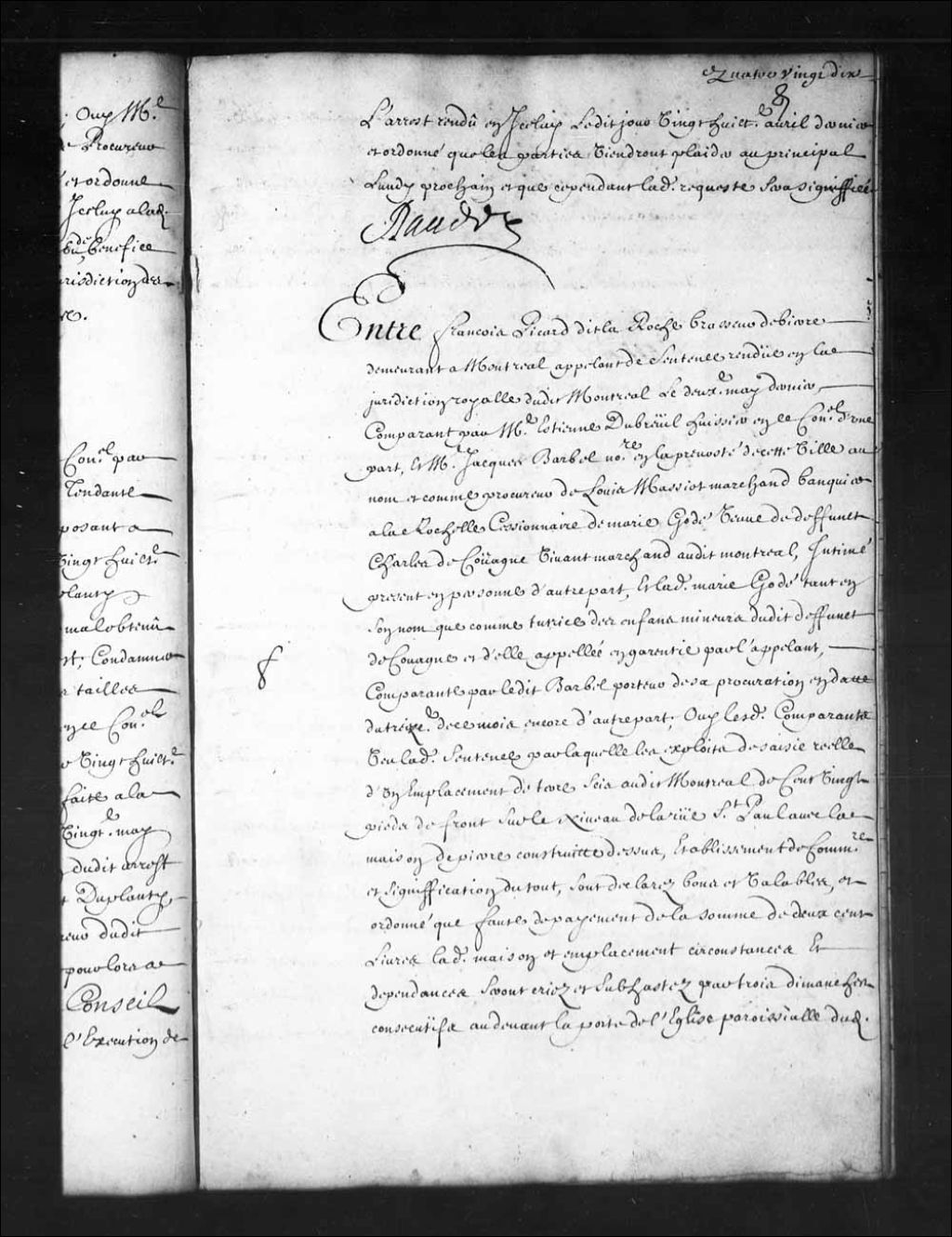 - Transcription du texte avec orthographe modernisée : «Entre François PICARD dit LAROCHE brasseur de bière demeurant à Montréal appelant de sentence rendue en la juridiction royale dudit Montréal le deuxième mai dernier, comparant par maître Etienne Dubreuil huissier en ce Conseil d'une part, et maître Jacques BARBEL notaire en la prévôté de cette ville au nom et comme procureur de Louis Massiot marchand banquier à La Rochelle cessionnaire de Marie Godé veuve de défunt Charles de Couagne vivant marchand audit Montréal, intimé présent en personne d'autre part, et ladite Marie Godé tant en son nom que comme tutrice des enfants mineurs dudit défunt de Couagne et d'elle appelée en garantie par l'appelant, comparante par ledit Barbel porteur de sa procuration en date du treizième de ce mois encore d'autre part; ouï lesdits comparants vu ladite sentence par laquelle les exploits de saisie réelle d'un emplacement de terre sis audit Montréal de [...]