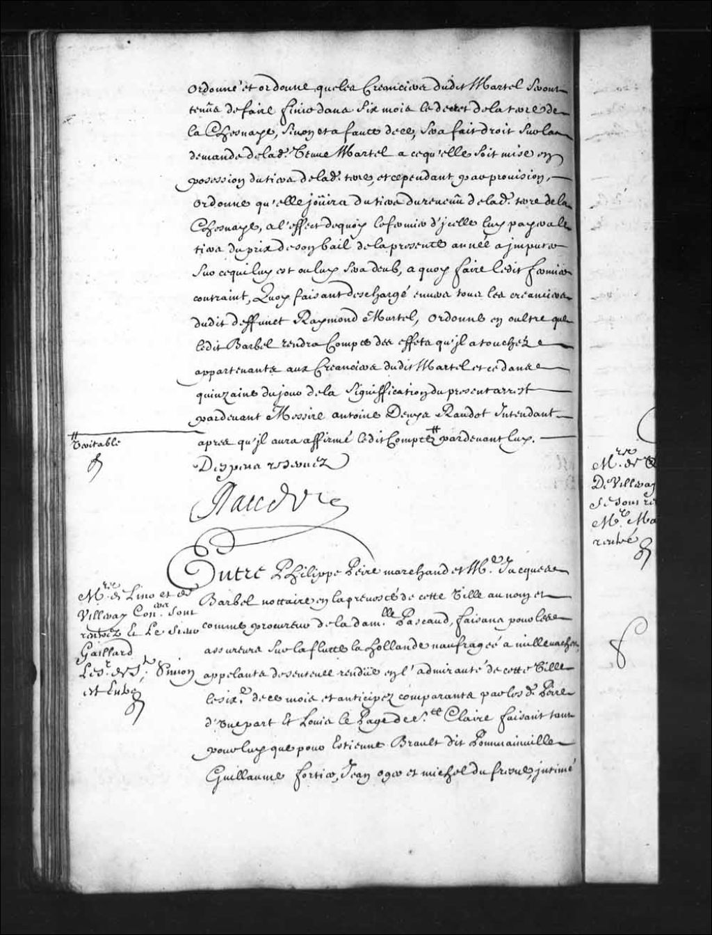 - Transcription du texte avec orthographe modernisée : «Messieurs Delino (De Lino) et de Villeray conseiller. sont rentrés et le sieur Gaillard. Le sieur de Saint-Simon est entré. Entre Philippe PEIRE marchand et maître Jacques BARBEL notaire en la prévôté de cette ville au nom et comme procureur de la demoiselle Pascaud (Pacaud), faisant pour les assureurs sur la flûte la Hollande naufragée à mille vaches, appelants de sentence rendue en l'amirauté de cette ville le sixième de ce mois et anticipés comparants par lesdits Peire d'une part et Louis LEPAGE DE STE CLAIRE (Sainte-Claire) faisant tant pour lui que pour Etienne Brault dit Pommainville Guillaume Fortier, Jean Oger et Michel Dufresne, intimé et anticipant comparant par maître Florent de LaCettière (Lacetière) aussi notaire en ladite prévôté d'autre part; et Joseph BOISSEL intervenant présent en personne encore d'autre part; ouï lesdits comparants; le Conseil avant faire droit sur ledit appel, ordonne qu'il sera informé à la diligence desdits appelants par-devant maître Augustin Rouer de Villeray conseiller qui se transportera sur les lieux, des faits de vol et divertissements mentionnés dans ladite sentence, circonstances, et dépendances, pour l'information vue être ordonné sur les faits résultants d'icelle et sur ledit appel ce qu'il appartiendra par raison et cependant défenses d'exécuter ladite sentence, dépens réservés. RAUDOT.»