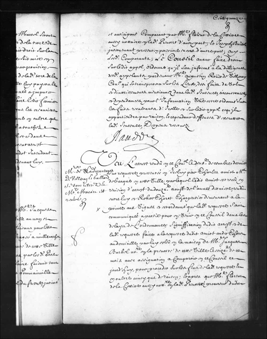 Transcription du texte avec orthographe modernisée : «Messieurs de Ladurantaye de Villeray et Gaillard se sont retirés et Monsieur Macart (Macard) est rentré. Vu l'arrêt rendu en ce Conseil le deuxième décembre dernier sur requête présentée en icelui par Charles Amiot (Amyot) maître de barque en cette ville par lequel ledit Amiot est reçu en révision d'arrêt du douzième août de l'année dernière, rendu entre lui et Robert Choret charpentier demeurant à la Pointe aux Vignes et est ordonné que ladite requête serait communiquée à partie pour en venir en ce Conseil dans les délais de l'ordonnance; signification dudit arrêt et de ladite requête faite à la requête dudit Amiot audit Choret au domicile par lui élu en la maison de maître Jacques Barbel notaire en la prévôté de cette ville le seizième de ce mois avec assignation à comparaître en ce Conseil ce jourd'hui, pour procéder sur les fins de ladite requête et en outre ainsi que de raison; [...]