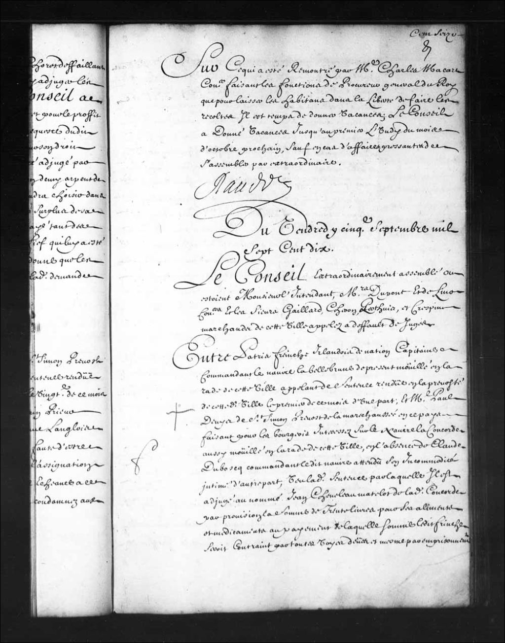 - Transcription du texte avec orthographe modernisée : «Du vendredi cinquième septembre mille sept cent dix. Le Conseil extraordinairement assemblé où étaient Monsieur l'intendant, Messieurs Dupont et Delino (De Lino) conseillers et les sieurs Gaillard, Cheron, Perthuis, et Crespin marchands en cette ville appelés à défaut de juges. Entre Patrik FREINCHE irlandais de nation capitaine commandant le navire la Bellebrune de présent mouillé en la rade de cette ville appelant de sentence rendue en la prévôté de cette dite ville le premier de ce mois d'une part; et maître Paul Denys (Denis) de Saint-Simon prévôt de la maréchaussée en ce pays faisant pour les bourgeois intéressés sur le navire la concorde aussi mouillé en la rade de cette ville, en l'absence de Claude Duboscq commandant ledit navire attendu son incommodité intimé d'autre part; vu ladite sentence par laquelle il est adjugé au nommé Jean Cheneleau matelot de ladite concorde par [...]
