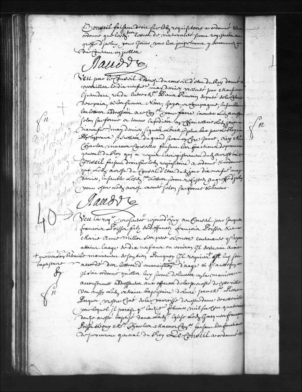 Ordre d'enregistrer l'arrêt du Conseil d'État du 19 mai 1709, rendu entre Denis Riverin, député de la colonie et les sieurs Neret, Gayot et compagnie, ainsi que les lettres relatives à ce sujet, 6 octobre 1710, Archives nationales à Québec, Fonds Conseil souverain, (03Q,TP1,S28,P8890).