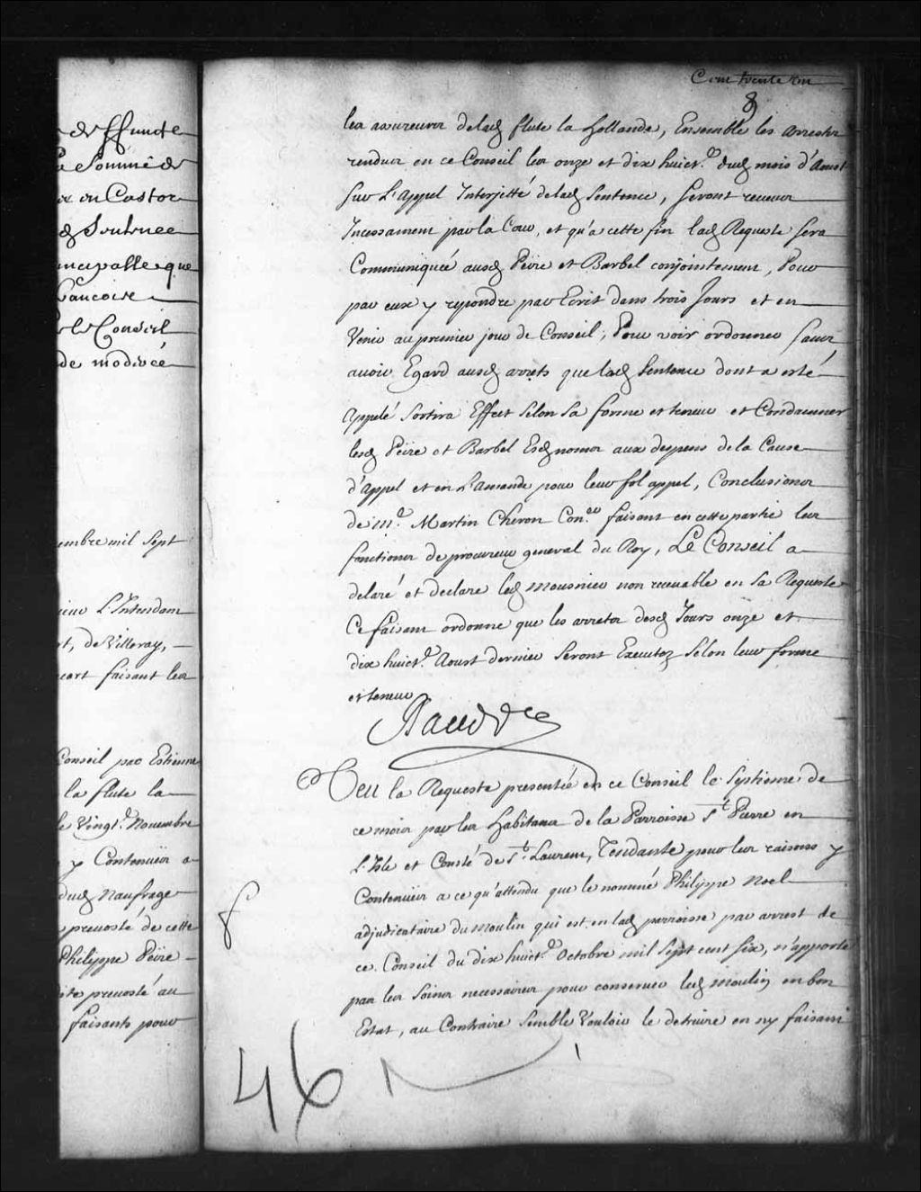 - Transcription du texte avec orthographe modernisée : «Vu la requête présentée en ce conseil le septième de ce mois par les habitants de la paroisse Saint-Pierre en l'île et comté de Saint-Laurent tendante pour les raisons y contenues à ce qu'attendu que le nommé Philippe Noël adjudicataire du moulin qui est en ladite paroisse par arrêt de ce Conseil du dix-huitième octobre mille sept cent six, n'apporte pas les soins nécessaires pour conserver ledit moulin en bon état, au contraire semble vouloir le détruire en ni faisant pas faire aucune des réparations qu'il est obligé d'y faire et en outre ne voulant pas fournir un chemin bon et valable auxdits habitants pour aller audit moulin, qu'icelui moulin soit adjugé et livré au nommé Jean Côté à bonne composition attendu les offres qu'il fait de faire toutes les réparations nécessaires audit moulin, et de fournir et entretenir un chemin bon et valable et fort commode, ce qui est avantageux pour la conservation dudit moulin et commodité desdits habitant, et ouï maître Charles Macart (Macard) conseiller faisant les fonctions de procureur général du Roi. Le Conseil avant faire droit sur ladite requête a ordonné et ordonne que visite sera faite du moulin en question par Pierre Gendron et Robert Gaulin que le Conseil a commis à cet effet en présence du sieur Lamy curé de la paroisse de la Sainte-Famille que le Conseil a aussi commis pour leur faire prêter serment, lesquels dresseront procès-verbal de l'état dudit moulin et donneront leur avis sur les réparations à faire à icelui, en faisant différence des grosses et menues réparations à y faire, et ce aux dépens de qui il appartiendra, ordonne aussi ledit conseil que lesdits Gendron et Gaulin en présence dudit sieur Lamy visiterons les deux chemins qui ont été pratiqués pour aller audit moulin et donneront leur avis par le même procès-verbal sur celui qui est le plus commode aux habitants qui y portent leurs grains de moudre, pour ledit procès-verbal vu être par le Conseil ordonné ce qu'il appartiendra par raison. RAUDOT.»