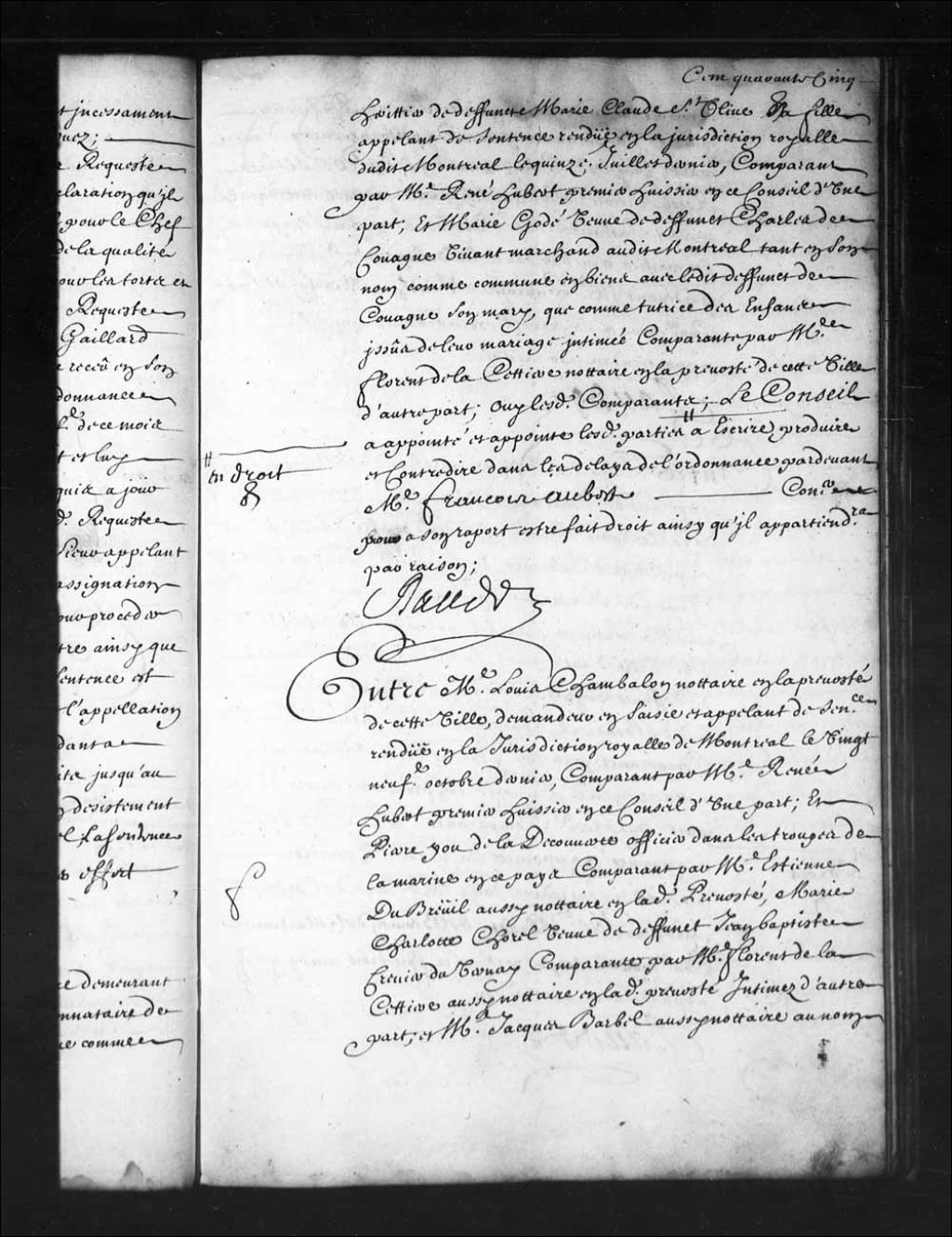 - Transcription du texte avec orthographe modernisée : «Entre maître Louis CHAMBALON notaire en la prévôté de cette ville, demandeur en saisie et appelant de sentence rendue en la juridiction royale de Montréal le vingt-neuvième octobre dernier, comparant par maître René Hubert premier huissier en ce Conseil d'une part; et Pierre YOU de La Découverte officier dans les troupes de la marine en ce pays comparant par maître Etienne Dubreuil aussi notaire en ladite prévôté, Marie Charlotte CHOREL veuve de défunt Jean-Baptiste Crevier Duvernay comparante par maître Florent de LaCettière (Lacetière) aussi notaire en ladite prévôté intimés d'autre part; et maître Jacques BARBEL aussi notaire au nom et comme tuteur de Jean-Baptiste Jenverin Dufresne partie intervenante présent en personne encore d'autre part; ouï lesdits comparants; le Conseil a reçu et reçoit ledit Barbel partie intervenante dans la présente instance et au surplus a appointé et appointe les parties à mettre dans les délais de l'ordonnance par-devant maître François Mathieu Martin Delino (De Lino) conseiller pour à son rapport être ordonné ce qu'il appartiendra par raison. RAUDOT.»
