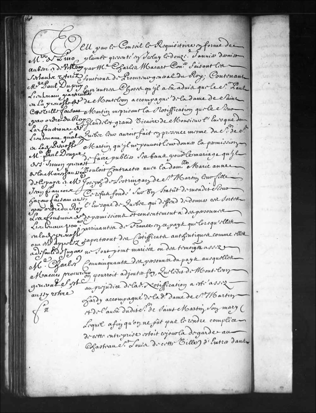 - Transcription du texte avec orthographe modernisée : «Messieurs Delino (De Lino) Aubert et de Villeray s'étant retirés maître Paul Dupuy lieutenant particulier en la prévôté de cette ville faisant par ordre du Roi les fonctions de lieutenant général en ladite prévôté maître Paul Denys (Denis) de Saint-Simon prévôt de la maréchaussée de ce pays et maître Jean François Hazeur faisant aussi par ordre du Roi les fonctions de lieutenant particulier en ladite prévôté ont été appelés à défaut de juges. maître Charles Macart (Macard) procureur général s'est aussi retiré. Vu par le Conseil le réquisitoire en forme de plainte présenté en icelui le douzième janvier dernier par maître Charles Macart (Macard) conseiller faisant les fonctions de procureur général du Roi; contenant entre autres choses qu'il a eu avis que le sieur Paul de Monteleon accompagné de la dame de Saint-Martin, méprisant la notification que le sieur Glandelet grand vicaire de Monsieur l'évêque de Québec leur aurait fait en présence même du sieur de Saint-Martin, qu'il ne pouvait leur donner la permission de faire publier ses bancs pour le mariage qu'il voulait contracter avec la demoiselle Marie Anne Joseph de Lestringan (Lestringant) de Saint-Martin leur fille ce refus fondé sur un statut de mondit sieur l'évêque de Québec qui défend de donner ces sortes de permissions et consentement a des personnes arrivantes de France en ce pays que lorsqu'elles rapporteront des certificats authentiques comme elles ne sont point mariées ou des témoignages assez convainquants des personnes du pays auxquelles on pourrait ajouter foi, que ledit de Monteleon au préjudice de ladite notification a été assez hardi accompagné de ladite dame de Saint-Martin et de l'aveu dudit sieur de Saint-Martin son mari lequel afin qu'on ne pût pas le rendre complice de cette entreprise était ce jour la de garde au château Saint-Louis de cette ville d'entrer dans l'église de Beauport le mercredi septième dudit mois à l'heure d'une messe que l'on disait ce jour la pour le mariage d'un des habitants de cette paroisse, et la aurait interpellé le sieur Boullard curé dudit lieu actuellement célébrant la messe laquelle était après la consécration de le marier avec ladite demoiselle de Saint-Martin et ensuite aurait déclaré tout haut qu'il prenait pour femme ladite demoiselle et elle aussi d'un même ton de voix aurait déclarée qu'elle prenait ledit de Monteleon pour son mari et qu'ils en prenaient tout le peuple qui était la assemblé a témoins; lequel scandale ledit sieur Boullard ne put empêcher dans le moment étant à la messe après la consécration, mais ensuite il leur déclara que ce mariage était illégitime étant fait contre les lois de l'église et qu'au lieu d'avoir fait un mariage Ils avaient fait une action exécrable et un attentat à son autorité dont il rendrait compte à ses supérieurs, que cet attentat n'était que la suite d'un autre commis par ledit de Monteleon dans la personne dudit sieur Glandelet qu'on peut dire prémédité puisqu'ils se sont succédés les uns aux autres et ne peuvent être tolérés l'un ayant été fait dans une maison religieuse comme est le séminaire et l'autre dans une église en présence de tout le peuple, ce qui mérite une punition exemplaire contre ceux qui en ont été les auteurs et les fauteurs le Roi étant le protecteur et le défenseur des droits et des canons de l'église et Jaloux de l'observation de ses ordonnances sur des matières de cette qualité il avait requis qu'il fût informé à sa requête desdits faits, circonstances et dépendances par tel de Messieurs qu'il plairait à la cour de commettre; et que cependant attendu que les lois tant canoniques que civiles regardent des mariages de la qualité de celui contracté par ledit de Monteleon comme mariages nuls et illicites et par conséquent comme un concubinage la cohabitation qu'ils pourraient avoir ensemble; ce qui causerait par la suite un grand scandale parmi tout le monde, il aurait aussi requis que défenses fussent faites audit de Monteleon d'habiter avec ladite Marie Anne Joseph de Lestringan et pour ôter les soupçons qu'on pourrait en avoir, ordonner qu'il se retirera dans vingt-quatre heures dans un lieu éloigné de la demeure de ladite demoiselle; arrêt rendu sur ledit réquisitoire ledit jour douzième janvier dernier par lequel il est ordonné qu'il sera informé des faits contenus audit réquisitoire à la requête dudit procureur général du Roi contre ceux qui y sont dénommés, par maître Paul Dupuy lieutenant particulier de la prévôté de cette ville faisant par ordre du Roi les fonctions de lieutenant général en ladite prévôté appelé à défaut de juges en nombre suffisant pour l'information communiquée audit procureur général être par ce Conseil ordonné ce qu'il appartiendrait par raison; et cependant fait inhibition et défenses audit Paul de Monteleon de voir, Fréquenter, ni habiter avec Marie Anne Joseph de Lestringan (Lestringant) de Saint-Martin à peine de cent livres d'amende applicable à la paroisse de Beauport et de prison, le tout encouru à la première contravention; signification dudit arrêt faite à la requête dudit procureur général du Roi audit de Monteleon le quinzième dudit mois de janvier avec commandement d'obéir au contenu en icelui sur les peines y énoncées; requête présentée en ce Conseil par le sieur Desmaiserets vicaire général de Monsieur l'évêque de cette ville de Québec, tendante pour les causes y contenues à ce qu'il plût à la Cour prendre son fait et cause, et en conséquence joindre ladite requête au réquisitoire dudit procureur général du Roi pour être poursuivie à sa requête, ce faisant condamner les personnes mentionnées en icelle et celles notoirement complices de l'exécution scandaleuse du mariage prétendu entre ledit de Monteleon et ladite de Lestringan, a en f