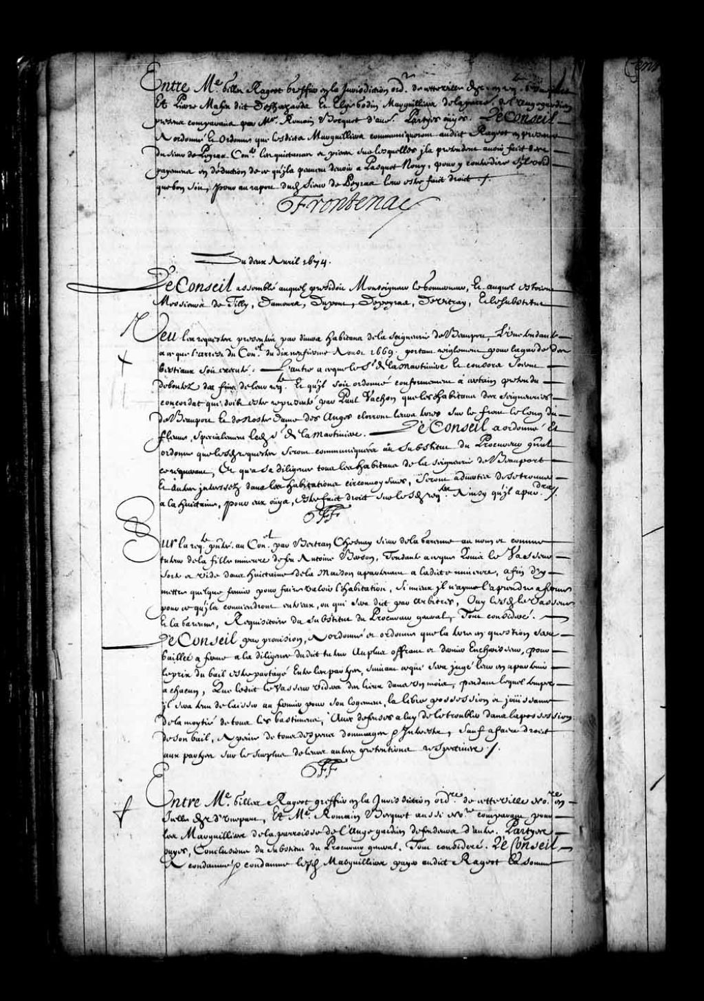 - Transcription du texte avec orthographe modernisée : «Sur la requête présentée au Conseil par Bertrand Chesnay sieur de LaGarenne au nom et comme tuteur de la fille mineure de feu Antoine Berson tendante à ce que Louis LeVasseur sorte et vide dans huitaine de la maison appartenant à ladite mineure, afin d'y mettre quelque fermier pour faire valoir l'habitation, si mieux il n'aime la prendre à ferme pour ce qu'ils conviendront entre eux, ou qui sera dit par arbitres; ouï lesdits LeVasseur et la Garenne; réquisitoire du substitut du procureur général, tout considéré. Le Conseil par provision a ordonné et ordonne que la terre en question sera baillée à ferme à la diligence dudit tuteur au plus offrant et dernier enchérisseur, pour le prix du bail être partagé entre les parties suivant ce qui sera jugé leur en appartenir a chacun; que ledit LeVasseur videra les lieux dans un mois, pendant lequel temps il sera tenu de laisser au fermier pour son logement la libre possession et jouissance de la moitié de tous les bâtiments, avec défenses à lui de le troubler dans la possession, de son bail, à peine de tous dépens, dommages et intérêts, sauf à faire droit aux parties sur le surplus de leurs autres prétentions respectives. FF.»