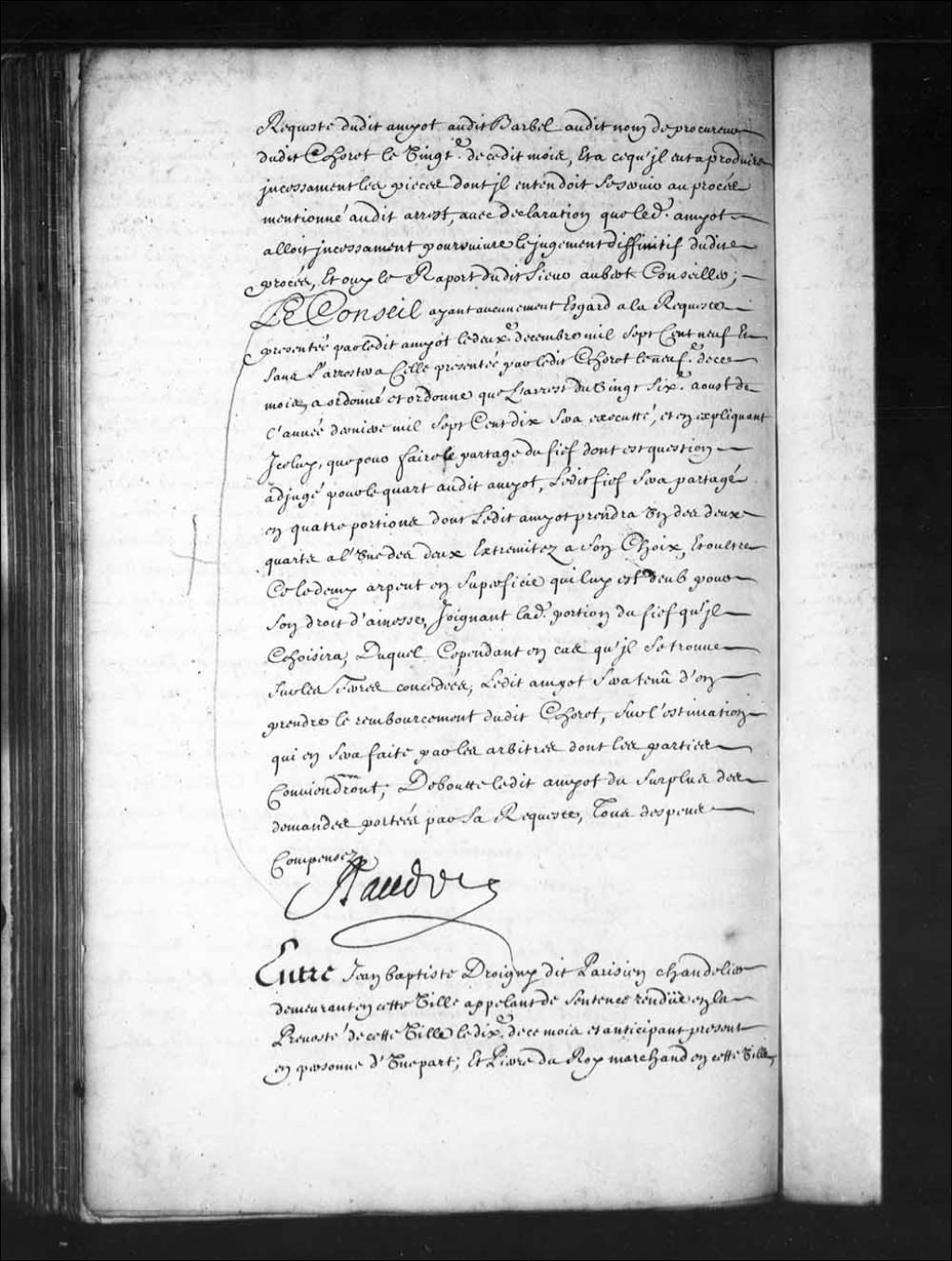 - Transcription du texte avec orthographe modernisée : «Entre Jean-Baptiste DROIGNY (Deroigny) dit PARISIEN chandelier demeurant en cette ville appelant de sentence rendue en la prévôté de cette ville le dixième de ce mois et anticipant présent en personne d'une part; et Pierre DUROY marchand en cette ville, et Marguerite LEVASSEUR sa femme, intimés, comparants par ladite Levasseur d'autre part. Parties ouïes; vu ladite sentence par laquelle il est ordonné que ledit appelant serait payé par ledit intimé à la journée au prix qu'il a accoutumé de le lui payer pour façon de chandelle, et ledit appelant condamné aux dépens de 'exploit; requête présentée en ce Conseil par ledit Droigny aux fins d'être reçu appelant de ladite sentence, et lui permettre de faire assigner lesdits intimés en ce Conseil pour voir dire qu'il a été mal jugé et bien appelé, ce faisant sans avoir égard à ladite sentence, les condamner solidairement à payer audit appelant la somme de deux cent cinquante livres pour la façon de deux mille cinq cents livres de chandelle, et aux dépens ordonnance étant ensuite de ladite requête en date du onzième de ce dit mois par laquelle ledit Droigny est reçu appelant et à lui permis de faire intimer ainsi qu'il est requis à certain et compétent jour; signification desdites requête et ordonnance faite à la requête dudit appelant auxdits intimés le douzième de ce dit mois avec assignation à comparaître ce jourd'hui en ce Conseil pour procéder sur les fins d'icelle et en outre ainsi que de raison; le Conseil a mis et met l'appellation au néant, ordonne que la sentence dont est appel du dixième de ce mois sortira son plein et entier effet, et condamne l'appelant aux dépens, de grâce sans amende. RAUDOT.»