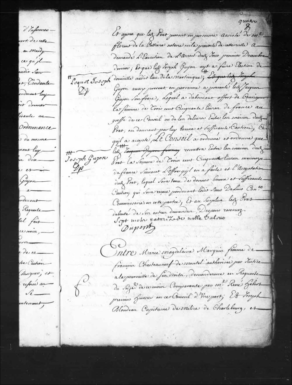 - Transcription du texte avec orthographe modernisée : «Entre Marie Madeleine MARQUIS femme de François Châteauneuf de montel autorisée par justice à la poursuite de ses droits, demanderesse en requête du seizième de ce mois comparante par maître René Hubert premier huissier en ce Conseil d'une part; et Joseph BLONDEAU capitaine de milice de Charlesbourg, et Agnès GIGUIERE (Giguère) sa femme auparavant veuve de Charles Marquis vivant huissier en la prévôté de cette ville défendeurs comparants par maître Florent de LaCettière (Lacetière) notaire en ladite prévôté d'autre part, ouï lesdits comparants, le Conseil a appointé et appointe les parties à écrire et produire dans les délais de l'ordonnance par-devant maître François Mathieu Martin Delino (De Lino) conseiller pour à son rapport leur être fait droit ainsi qu'il appartiendra par raison. DUPONT.»
