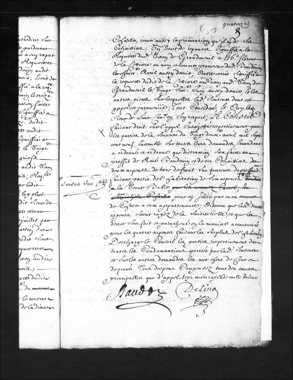 - Transcription du texte avec orthographe modernisée : «Messieurs Macart (Macard) et Cheron conseillers se sont retirés. Entre Jacques MONTAMBAULT et Pierre DUFRESNE habitants de l'île Saint-Laurent au nom et comme donataires et légataires de défunt Jacob L'heureux (Lereau, Levreau) vivant aussi habitant en ce pays, demandeurs en requête par eux présentée à Monsieur l'intendant le neuvième mars dernier présents en personnes d'une part; et Madeleine RACLOS femme de Nicolas Perrot et seule héritière par testament de défunt François Perrot leur fils défenderesse comparante par Nicolas Perrot son fils porteur de son pouvoir du 30e juin dernier d'autre part; et maître Pierre ROBINEAU baron de Beccancourt (Bécancour) conseiller du Roi et son grand voyer assigné en garantie à la requête de ladite Raclos comparant par maître Florent de Lacettierre (Lacetière) notaire en la prévôté de cette ville encore d'autre part; ouï lesdits comparants, vu ladite requête tendante pour les causes y contenues à ce que vu l'arrêt rendu en ce Conseil le trente et unième et dernier août mille six cent quatre-vingt-dix-neuf, par lequel il est donné défaut audit sieur de Beccancourt contre ledit L'heureux (Lereau, Levreau), et pour le profit ledit L'heureux (Lereau, Levreau) condamné à payer dans un mois dudit jour audit sieur de Beccancourt les cens et rentes et autres choses qu'il lui pouvait devoir suivant et conformément à l'arrêt du sixième avril de ladite année, et audit Perrot la somme de deux cent quatre-vingt livres tant pour les améliorations de la terre en question que pour une maison faite par ledit Perrot sur ladite terre suivant le procès-verbal du vingtième dudit mois d'août mille six cent quatre-vingt-dix-neuf, non compris les grains qui étaient actuellement pendants par les racines sur icelles, et pour vingt-huit livres de bois de charpente qui était sur la place destiné à faire une grange, lesquels appartiendraient audit Perrot pour en disposer ainsi que bon lui semblerait; sinon et à faute dudit payement et ledit mois passé ledit L'heureux (Lereau, Levreau) demeurerait déchu de ladite terre, laquelle appartiendrait audit Perrot en pleine propriété à l'avenir pour en jouir par lui conformément au contrat de concession que lui en avait fait ledit sieur de Beccancourt; et ledit L'heureux (Lereau, Levreau) aussi condamné aux dépens faits depuis l'arrêt du sixième juillet de ladite année et signification d'icelui; autre arrêt du douzième octobre de ladite année mille six cent quatre-vingt-dix-neuf par lequel il est ordonné que l'arrêt dudit jour trente et unième août sortirait son plein et entier effet selon sa forme et teneur, et ledit L'heureux (Lereau, Levreau) condamné aux dépens il plut à mondit sieur l'intendant leur remettre recevoir lesdits demandeurs opposants à l'exécution desdits arrêts ci-devant datés, ce faisant leur permettre de faire assigner ledit sieur de Beccancourt; et ledit Perrot en ce Conseil, pour voir dire et ordonner que sans avoir égard à iceux arrêts, et sentence rendue en la juridiction des Trois-Rivières, ledit Perrot leur délaisserait et abandonnerait ladite habitation avec ses appartenances et dépendances, ce faisant être condamné à leur rendre et restituer comme acquéreur de mauvaise foi tous les fruits et levées qu'il a perçus et recuellis sur ladite habitation ou pu y recueillir et en tous leurs dépens, dommages et intérêts soufferts et à souffrir, ordonnance de mondit sieur l'intendant étant ensuite de ladite requête dudit jour neuvième mars dernier portant que les parties se pourvoiraient en ce Conseil, à l'effet de quoi lesdits demandeurs feraient assigner par Abel Michon huissier de Saurel et autres côtes qui bon leur semblerait dans les délais de l'ordonnance, signification desdites requête et ordonnance faite à la requête desdits demandeurs à ladite défenderesse par ledit Michon le quatorzième dudit mois de mars avec assignation en ce Conseil au premier lundi d'après la Quasimodo dernier; arrêt rendu en ce Conseil le trentième dudit mois de mars sur requête présentée en icelui par ladite Madeleine Raclos défenderesse, par lequel il est ordonné que ledit sieur Robineau de Beccancourt, ensemble lesdits demandeurs seraient assignés à la requête dudit Nicolas Perrot et de ladite Raclos sa femme à comparaître en ce Conseil, par Daniel Normandin huissier, pour iceux ouïs être ordonné ce qu'il appartiendra par raison, et cependant permis audit Perrot et à ladite Raclos de faire ensemencer ladite terre en question et de continuer les travaux qui sont nécessaires sur icelle; signification dudit arrêt faite à la requête desdits Perrot et sa femme audit sieur de Beccancourt par ledit Normandin le cinquième mai aussi dernier avec assignation à ce jour en ce conseil, exploit de signification dudit arrêt de ladite assignation faite auxdits demandeurs le vingt-deuxième juin aussi dernier avec assignation à comparaître ce jourd'hui en ce Conseil, vu aussi les arrêts desdits jours trente et unième août et douzième octobre mille six cent quatre-vingt-dix-neuf; le Conseil a déclaré et déclare Jacques Montambault et Pierre Dufresne desdits noms non recevables en leur requête et les a condamnés aux dépens sans frais de voyage. RAUDOT.»