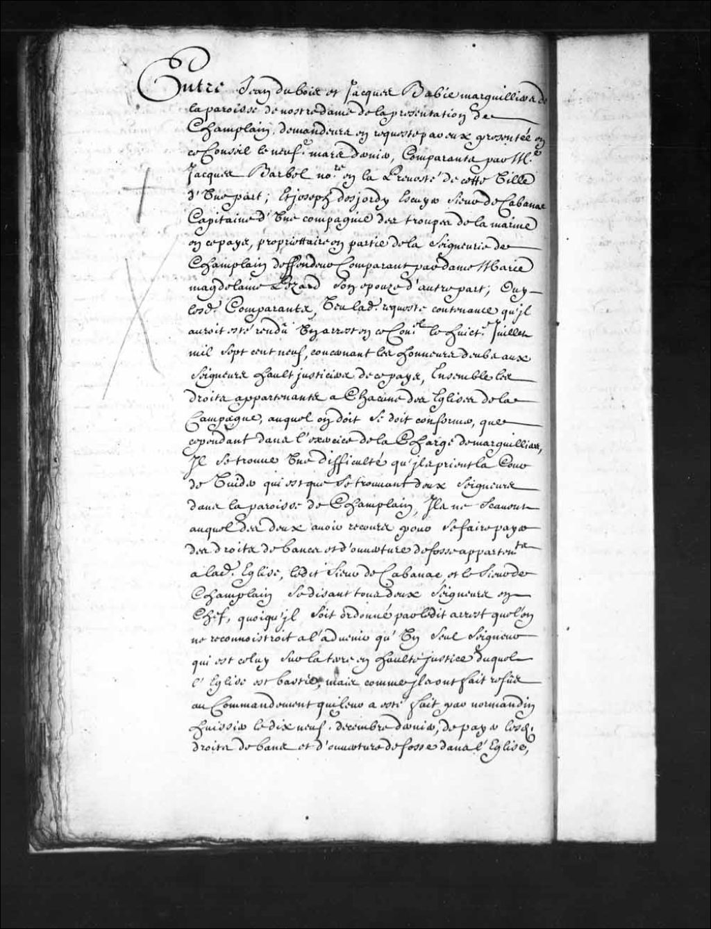- Transcription du texte avec orthographe modernisée : «Entre Jean DUBOIS et Jacques Babie (Baby) marguilliers de la paroisse de Notre-Dame de la présentation de Champlain, demandeurs en requête par eux présentée en ce Conseil le neuvième mars dernier, comparants par maître Jacques Barbel notaire en la prévôté de cette ville d'une part; et Joseph DESJORDI (Dejordy, Desjordy) écuyer sieur de CABANAC capitaine d'une compagnie des troupes de la marine en ce pays, propriétaire en partie de la seigneurie de Champlain défendeur comparant par dame Marie Madeleine Pezard son épouse d'autre part; ouï lesdits comparants, vu ladite requête contenante qu'il aurait été rendu un arrêt en ce Conseil le huitième juillet mille sept cent neuf, concernant les honneurs dus aux seigneurs haut justiciers de ce pays, ensemble les droits appartenants a chacune des églises de la campagne, auquel on doit se conformer, que cependant dans l'exercice de la charge de [...]