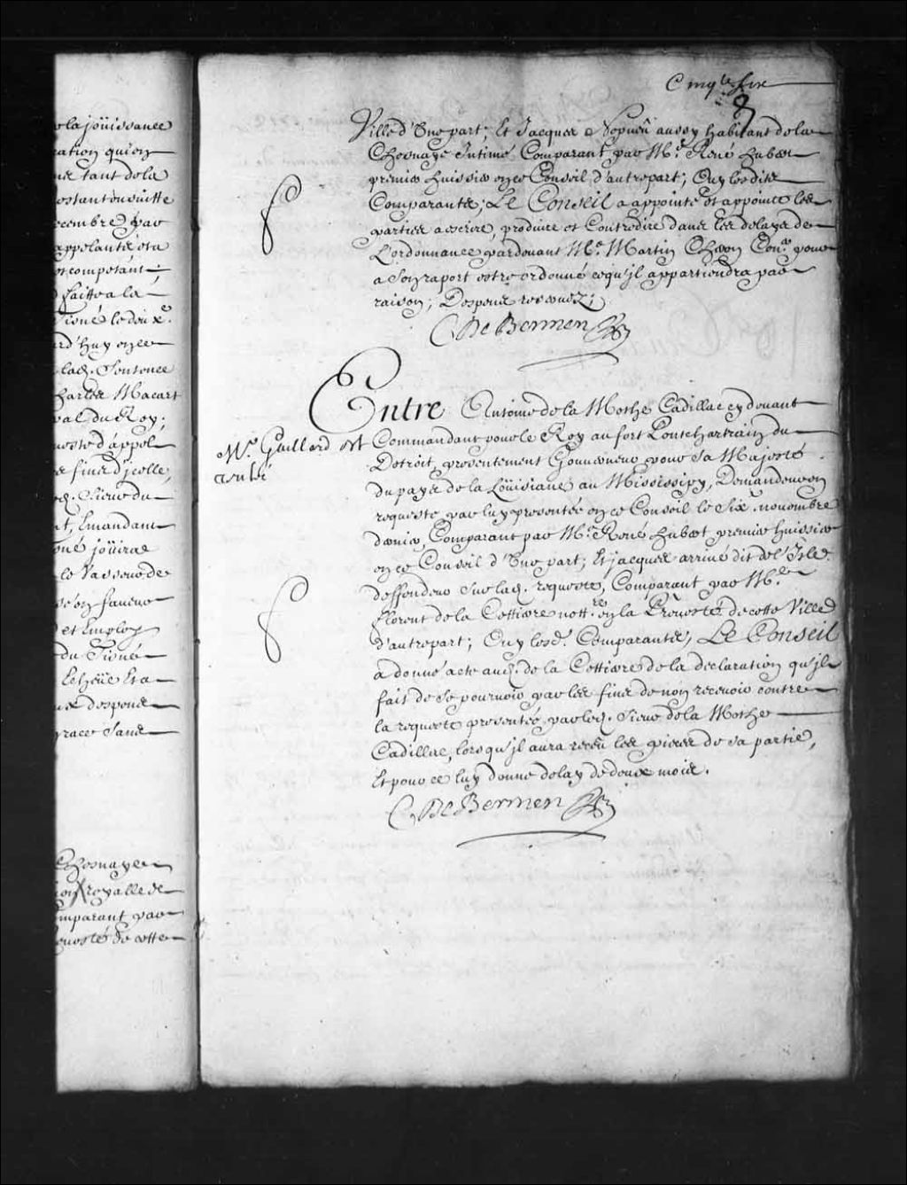 Transcription du texte avec orthographe modernisée : «Maître Gaillard est rentré. Entre Antoine de LAMOTHE CADILLAC ci-devant commandant pour le Roi au fort Pontchartrain du Détroit, présentement gouverneur pour sa Majesté du pays de la Louisiane au Mississipi, demandeur en requête par lui présentée en ce Conseil le sixième novembre dernier, comparant par maître René Hubert premier huissier en ce Conseil d'une part; et Jacques Arrivé dit Delisle défendeur sur ladite requête, comparant par maître Florent de Lacettierre (Lacetière) notaire en la prévôté de cette ville d'autre part; ouï lesdits comparants, le Conseil a donné acte audit de LaCettierre de la déclaration qu'il fait de se pourvoir par les fins de non recevoir contre la requête présentée par ledit sieur de LaMothe Cadillac, lorsqu'il aura reçu les pièces de sa partie, et pour ce lui donne délai de deux mois. C. DE BERMEN»