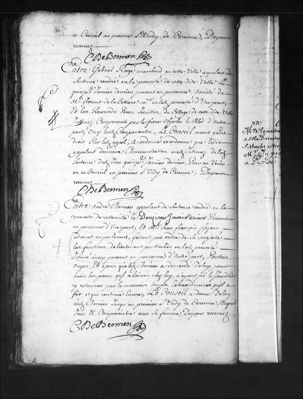 Transcription du texte avec orthographe modernisée : «Entre André BERNIER appelant de sentence rendue en la prévôté de cette ville le douzième janvier dernier présent en personne d'une part, et maître Jean François HAZEUR avocat en parlement, faisant par ordre de sa majesté les fonctions de lieutenant particulier en ladite prévôté intimé aussi présent en personne d'autre part. Parties ouïes, et après que ledit Bernier a demandé délai pour avoir les pièces qu'il a laissées chez lui n'ayant pu le jourd'hier y retourner par le mauvais temps extraordinaire qu'il a fait et qui continue encore, le Conseil a donné délai audit Bernier jusqu'au premier lundi de carême, auquel jour il comparaîtra avec sa femme, dépens réservés. C. DE BERMEN»