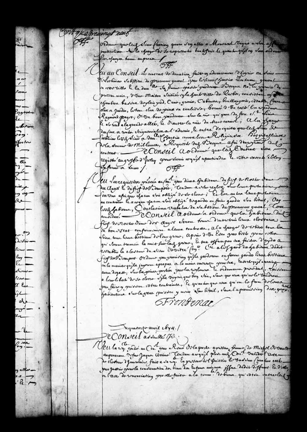 - Transcription du texte avec orthographe modernisée : «Du quatorze avril 1674. Le Conseil assemblé idem. Vu la requête présentée au Conseil par Renée de Laporte à présent femme de Michel Devaut auparavant veuve Jacques arrivé, tendant à ce qu'il plût audit Conseil valider l'acte de clôture d'inventaire fait à sa requête en présence de l'huissier LeVasseur curateur créé par justice pour la conservation des biens des enfants mineurs issus dudit défunt et d'elle, et l'acte de renonciation par elle fait à la communauté de biens qui était entre ledit défunt et elle; inventaire des biens de ladite communauté fait par Becquet notaire le dix-sept août 1673 auquel se serait opposé le sieur de LaGarenne, créancier de ladite communauté pour la somme de cent soixante livres; acte de clôture dudit inventaire faite par-devant le lieutenant général de cette ville le six avril dernier; sentence dudit lieutenant général du dix du présent mois, par laquelle ladite de Laporte est renvoyée à se pourvoir audit Conseil pour lesdites clôture d'inventaire et renonciation; ouï le sieur Dupont conseiller aussi créancier de ladite communauté; conclusions verbales du substitut du procureur général, le Conseil a débouté et déboute ladite de Laporte des fins de sa dite requête, et au surplus de ses prétentions renvoyée à se pourvoir par-devant ledit lieutenant général, pour lui être par lui fait droit, sauf l'appel. FF.»
