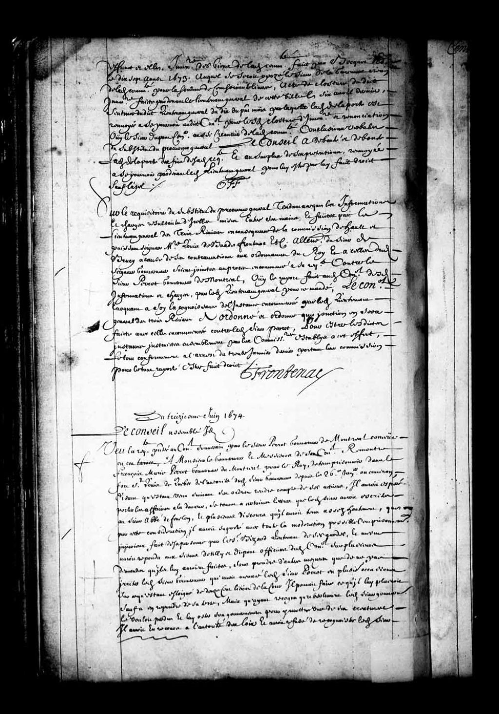 - Transcription du texte avec orthographe modernisée : «Du treizième juin 1674. Le Conseil assemblé idem. Vu la requête présentée au Conseil souverain par le sieur Perrot gouverneur de Montréal conçue en ces termes, à Monsieur le gouverneur et Messieurs de son Conseil; remontre François Marie Perrot gouverneur du Montréal pour le Roi détenu prisonnier dans le fort Saint-Louis de Québec de l'autorité dudit sieur gouverneur depuis le 26e janvier ou environ, disant qu'étant venu suivant ses ordres rendre compte de ses actions, il aurait espéré porter les affaires à la douceur, se tenants à certaines lettres que ledit sieur aurait écrites au sieur abbé de Fenelon, et plusieurs discours qu'il aurait tenu assez hautement, que par cette considération il aurait supporté avec toute la modération possible l'emprisonnement injurieux fait de sa personne par le sieur Bizard lieutenant de ses gardes, et même aurait répondu au sieurs de Tilly et Dupont [...]