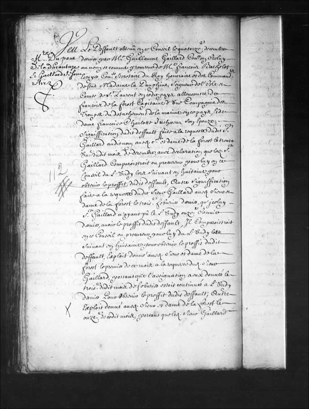 Transcription du texte avec orthographe modernisée : «Messieurs Dupont de Ladurantay et Gaillard se sont retirés. Vu le défaut obtenu en ce Conseil le quatorzième décembre dernier par maître Guillaume Gaillard conseiller en icelui au nom et comme procureur de maître François Berthelot écuyer conseiller secrétaire du Roi honoraire et des commandements de feue Madame la Dauphine, seigneur de l'île et comté de Saint-Laurent en ce dit pays à l'encontre de François de Laforest capitaine d'une compagnie des troupes du détachement de la marine en ce pays, et de dame Françoise Charlotte Juchereau son épouse; signification dudit défaut faite à la requête dudit sieur Gaillard audit nom auxdits sieurs et dame de Laforest le trente et unième dudit mois de décembre, avec déclaration que ledit sieur Gaillard comparaîtrait ou procureur pour lui en ce Conseil du lundi lors suivant en huitaine pour obtenir le profit dudit défaut, autre signification [...]